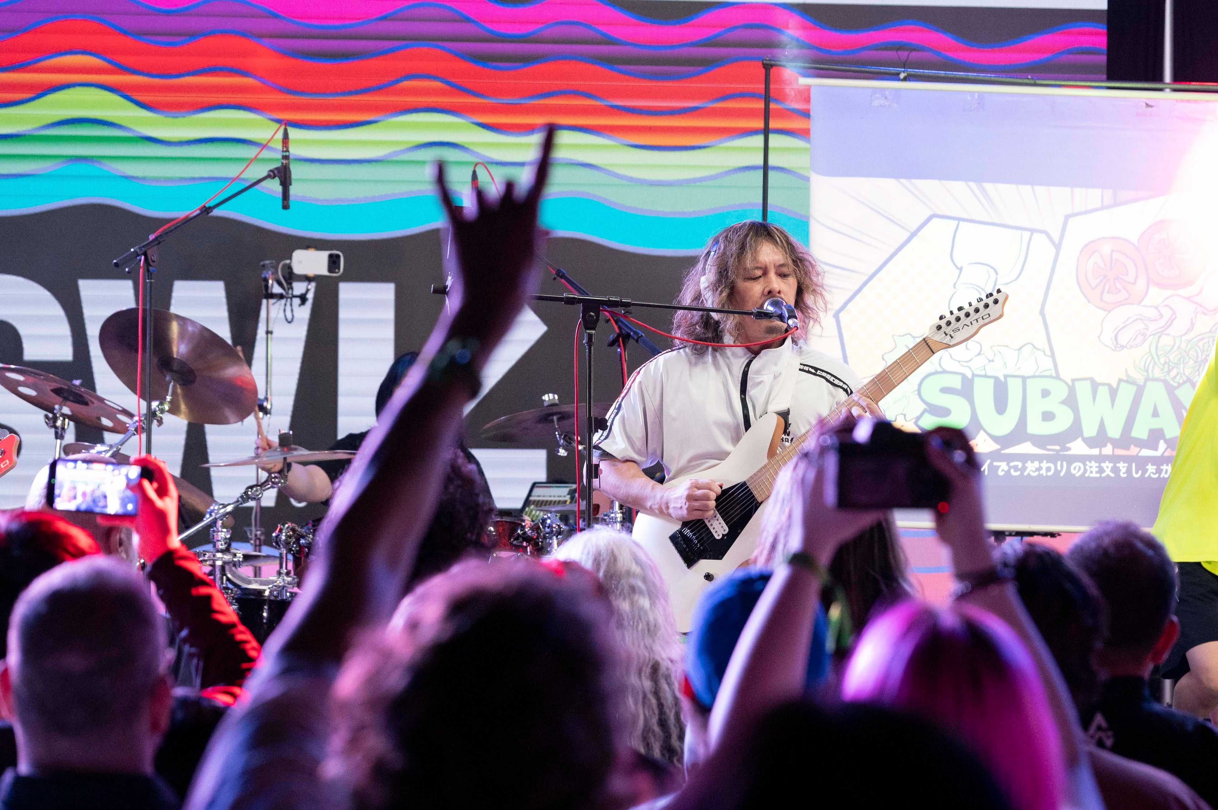 ステージセットはフルバンド仕様へと転換。打首獄門同好会が一曲目の「WAZA」から轟音を鳴らすと、フロアの熱気が炸裂した。スクリーンに映し出されたコミカルなミュージックビデオと歌詞の英訳で笑いを誘い、“もっと英語が話せたらいいのに”という大澤敦史(Vo./Gt.)の想いが正直に綴られた全英詞の最新曲「I wish I could speak English」では、ユーモアたっぷりのパフォーマンスで国境を越えた共感を呼び、“生活密着型ラウドロック”ならではの爆音と爆笑を届けた。