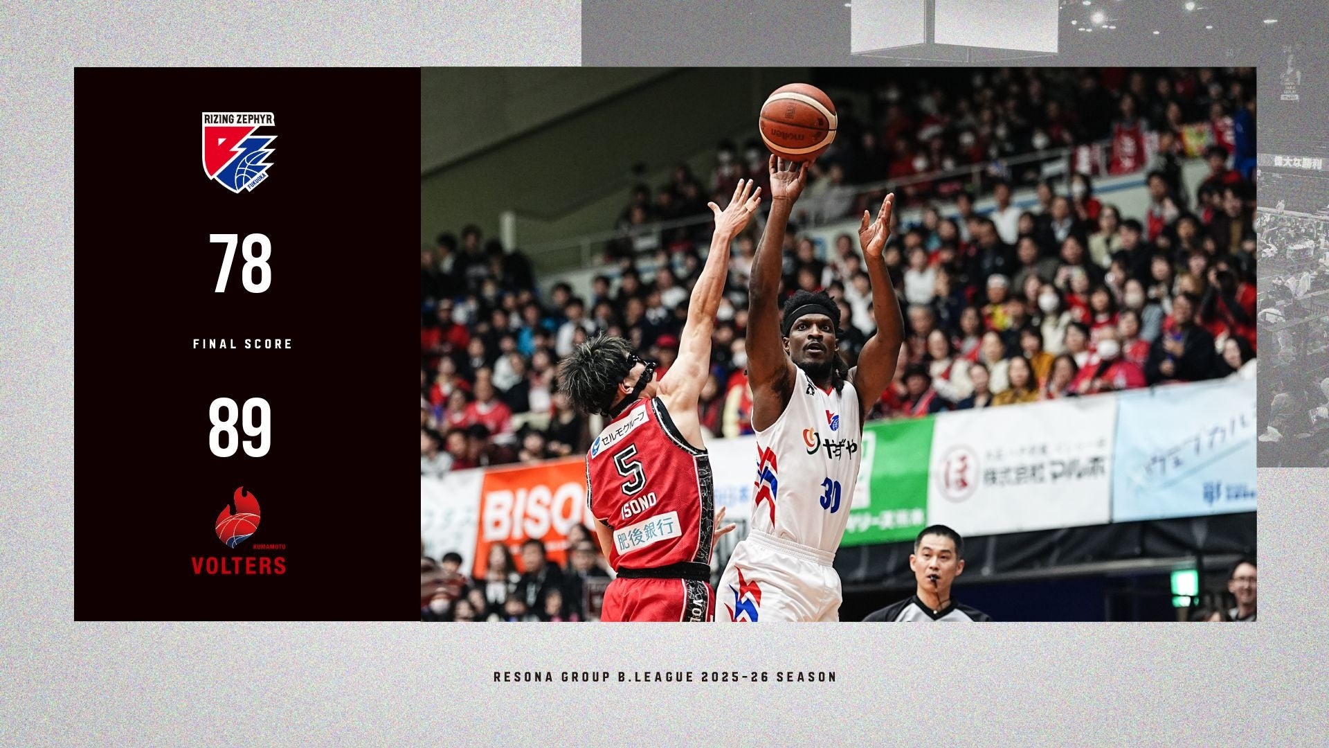 2026年3月18日(水)に開催した、りそなグループ B.LEAGUE 2025-26 シーズン【ライジングゼファーフクオカ vs.熊本ヴォルターズ】戦は、“福岡 78-89 熊本”で福岡の敗戦となりました。