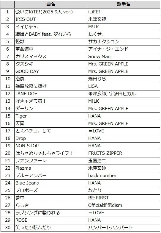 集計期間:2025年12月1日~2026年1月31日 ※曲名50音順