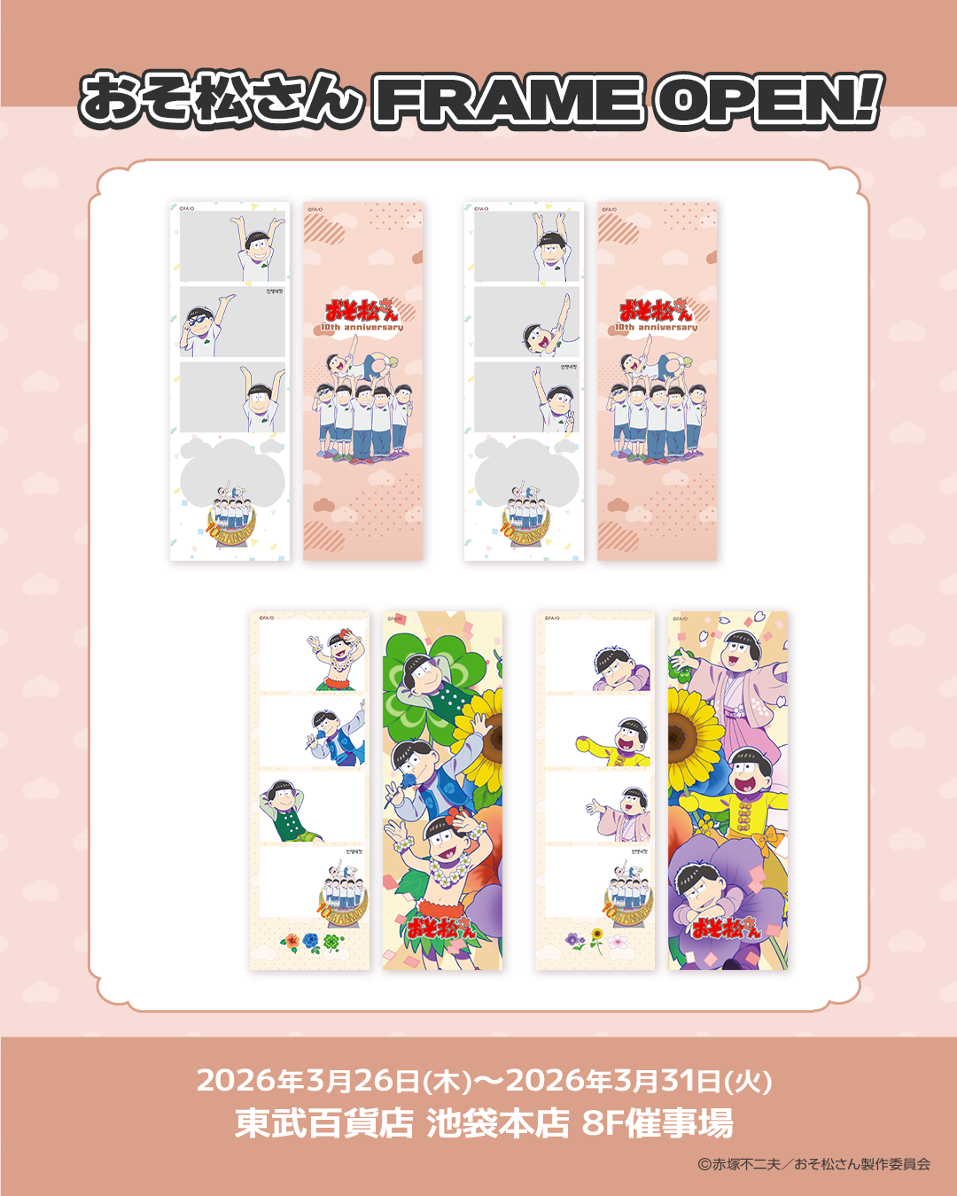 本コラボでは、物販イベント「大松の市」限定で、ここでしか撮影できないオリジナルフレームが登場。6つ子たちと一緒に写真撮影が楽しめる、ファン必見の特別仕様となっております。