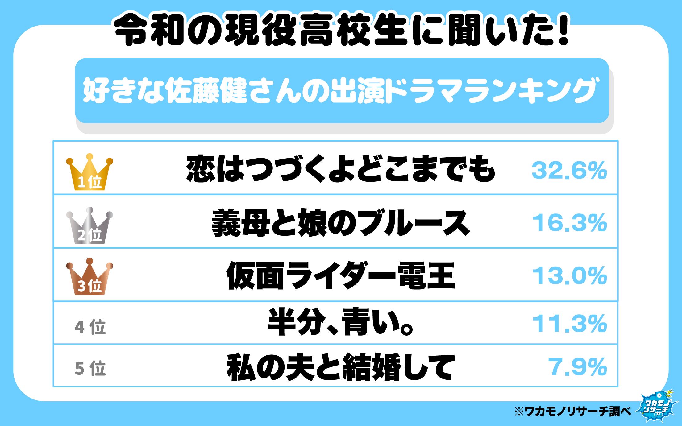 続いて、ワカモノリサーチでは「佐藤健さんの出演するドラマを見たことがある」と回答した高校生に「好きな佐藤健さんが出演するドラマはなんですか?」というアンケート調査を実施し