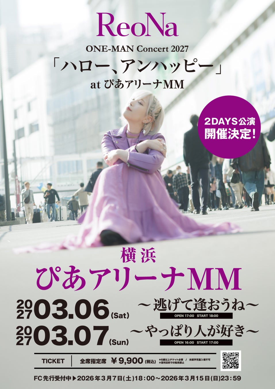 2027年3月6日(土)・7日(日)の2日間、過去最大規模となる、ぴあアリーナMM公演2days『2027/3/6(土)ReoNa ONE-MAN Concert 2027「ハロー、アンハッピー」atぴあアリーナMM ~逃げて逢おうね~』、『2027/3/7(日)ReoNa ONE-MAN Concert 2027「ハロー、アンハッピー」atぴあアリーナMM ~やっぱり人が好き~』の開催を発表。