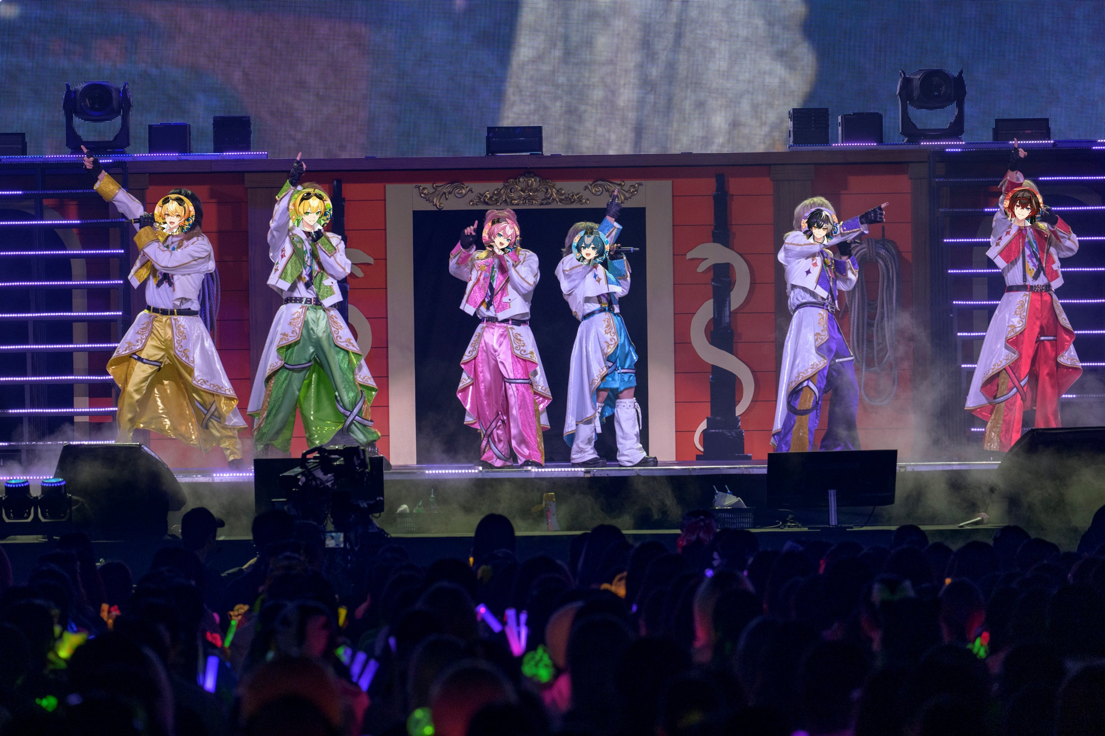 さらに、ステージ初披露となる初のペア曲を連打。まぜ太のアクロバティックなパフォーマンスやあっとの圧倒的な歌唱力で会場を一気に引き込み、楽曲の魅力を解き放った「We Own The World」。歌声、衣装、動き、ラストポーズまですべてがかわいいを極めた、ちぐさくんとけちゃの「ペットに恋しちゃダメですか?」。サイバーパンクな演出の中、トイガンのロケットランチャーを手に奔放に無双した、あっきぃとぷりっつの「イタズランチャー!」。息ぴったりなバディそれぞれに情緒をかき乱される時間もまた、とんでもなく楽しい。