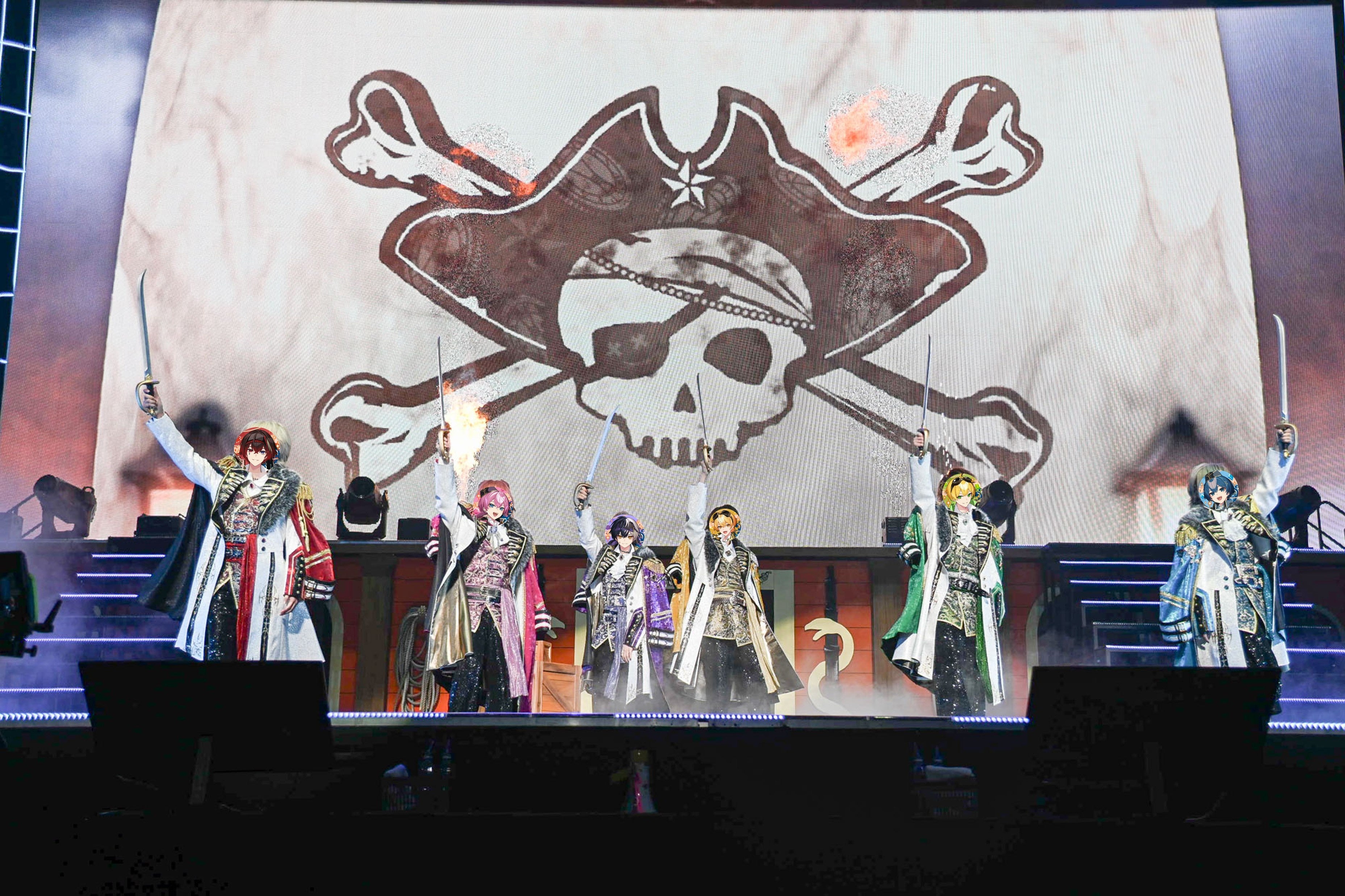 ステージ演出が切り替わり、スクリーンに映る髑髏の旗を背にゴージャスな海賊風新衣装をまとった6人が登場! ファイヤーボールとスパークラーが派手に噴き上がる中、上昇する可動ステージで手にした海賊刀を高く掲げ勇ましく歌うのは、今回のワンマンライブ表題曲であり初披露となる「Wild Side Sailing 88%」だ。どんなに荒れ狂う海も、この6人とリスナーが一緒なら怖くない、進んでいける。その熱い想いと結束感に、胸が熱くなる。