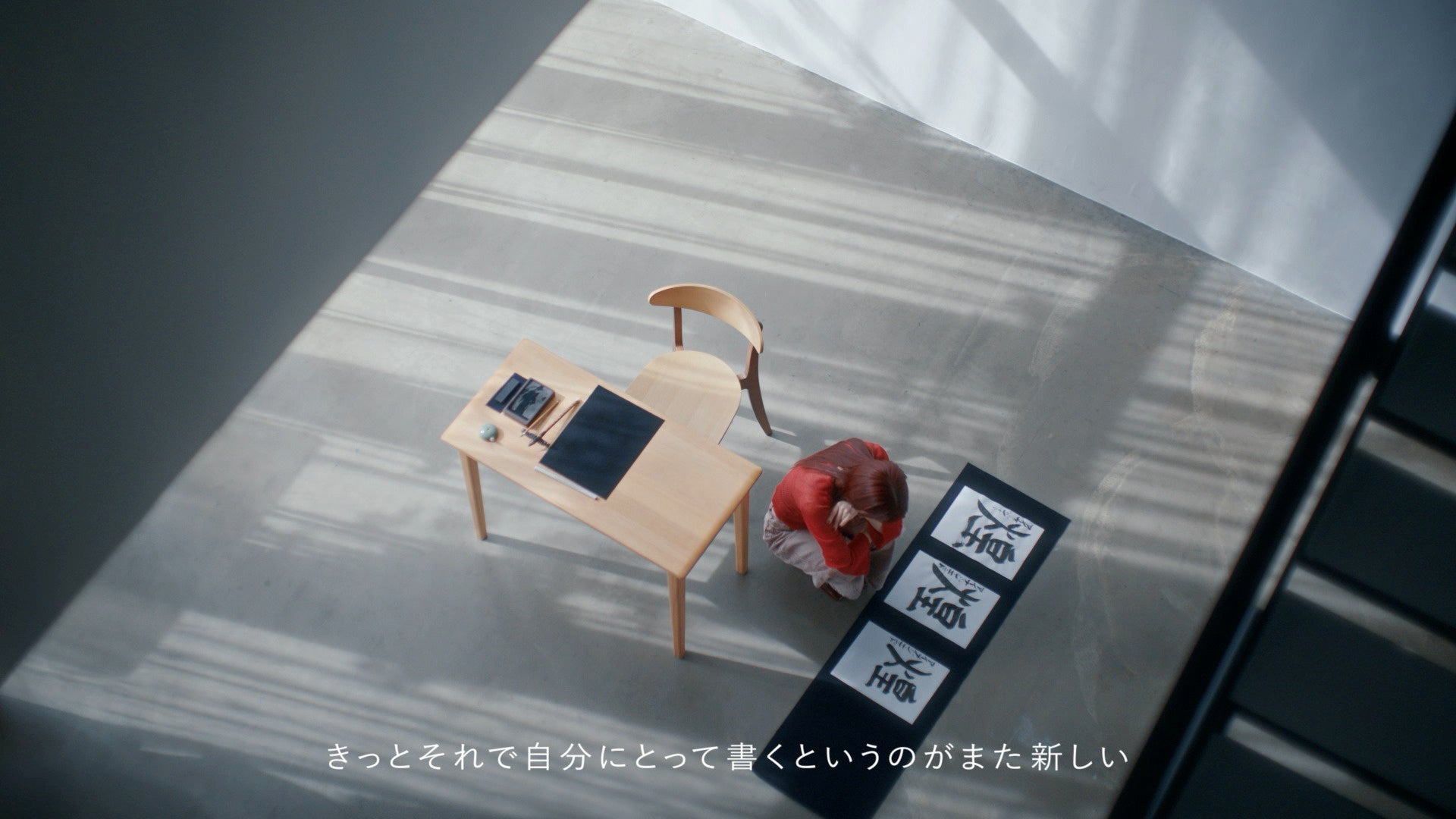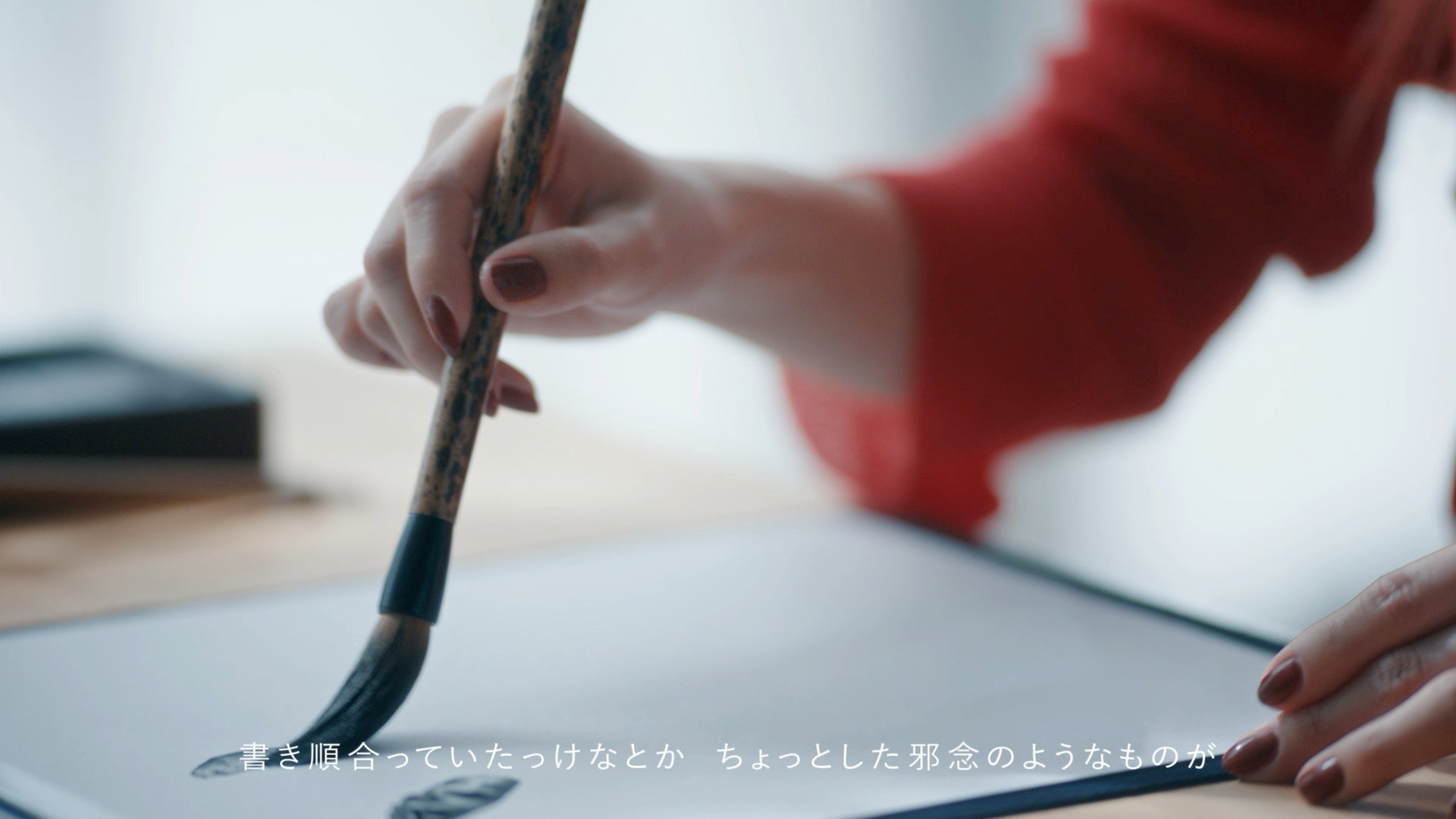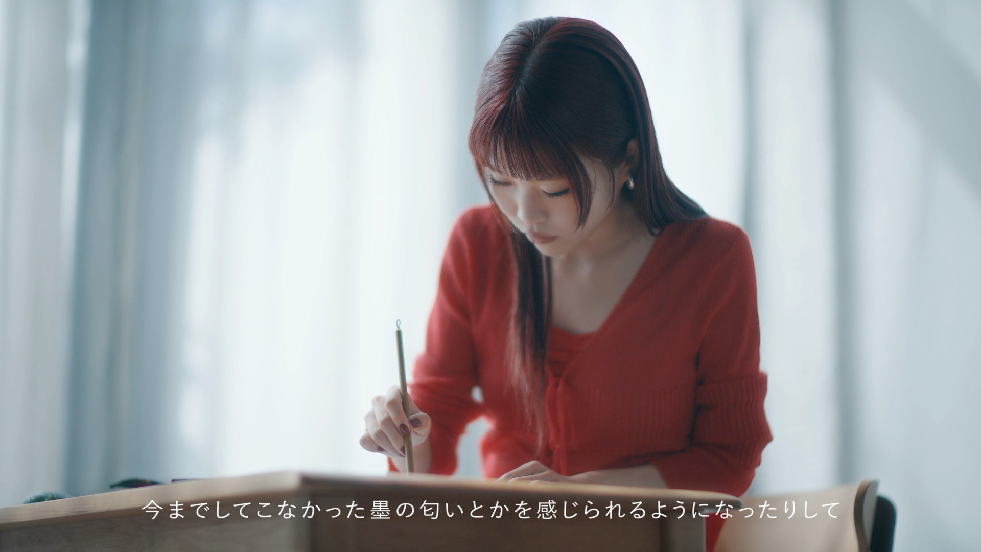 本ムービーの舞台は、あえて「和室」という書道らしい固定観念を離れた空間で、アイナ・ジ・エンドさんが筆と墨と半紙だけで自分自身と対峙します。好奇心あふれる前のめりな姿勢から、徐々に感覚が研ぎ澄まされ、気持ちが整っていく彼女のプロフェッショナルな姿が垣間見られます。同じ文字を黙々と書き続け、何度も書き直し、時には「失敗しちゃった」と言わんばかりのお茶目な表情を浮かべ、彼女が一筆に込めた言葉は「煌」。創作の苦悩と、「まるで新しい扉を開いてもらった」と達成感あふれるアイナ・ジ・エンドさんの表情を捉えた、ドキュメンタリーのような映像にご注目ください。