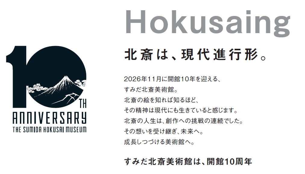 なお、当館は2026年11月22日に開館10周年を迎えます。これに向けて10周年ロゴおよびステートメントを別紙のとおり策定しました。今後予定している記念事業を通じて、北斎の魅力をさらに国内外へ発信していきます。