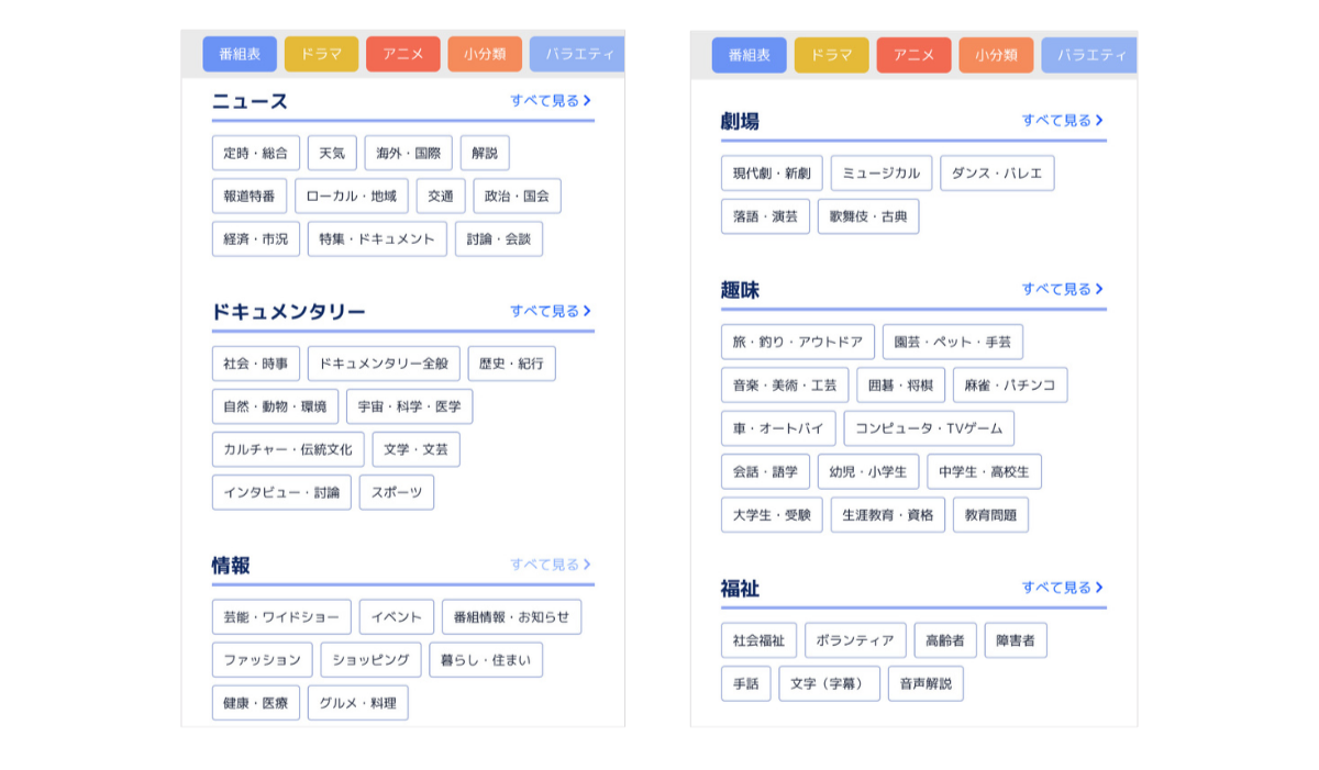 「ニュース」「ドキュメンタリー」「情報」「劇場」「趣味」「福祉」