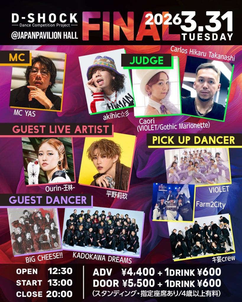 全国規模のストリートダンスコンテスト「D-SHOCK」(主催:株式会社Chord Prise、代表取締役:来栖直哉)は、2026年3月31日(火)に埼玉県所沢市のところざわサクラタウン「JAPAN PAVILION HALL A」にて「Dance Competition Project D-SHOCK 2025-2026 FINAL」を開催いたします。