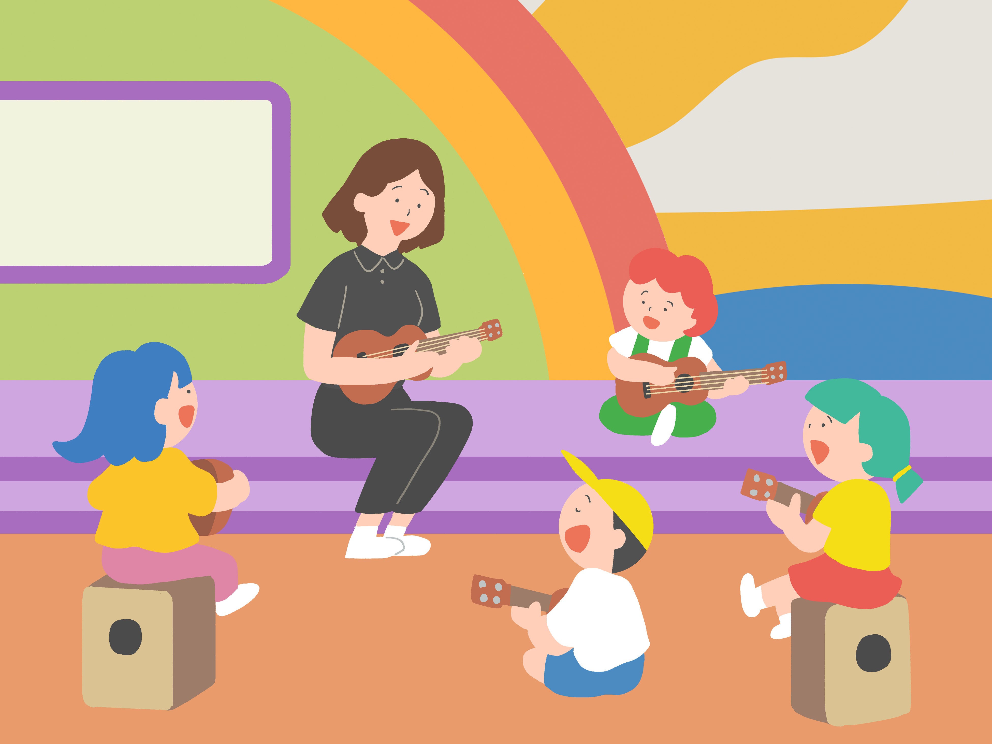 キャストの真似をしながら簡単なコードを覚えて、ウクレレに親しめるイベントです。最後は童謡などお子さまに人気の曲を、みんなで弾き語りして楽しみます。