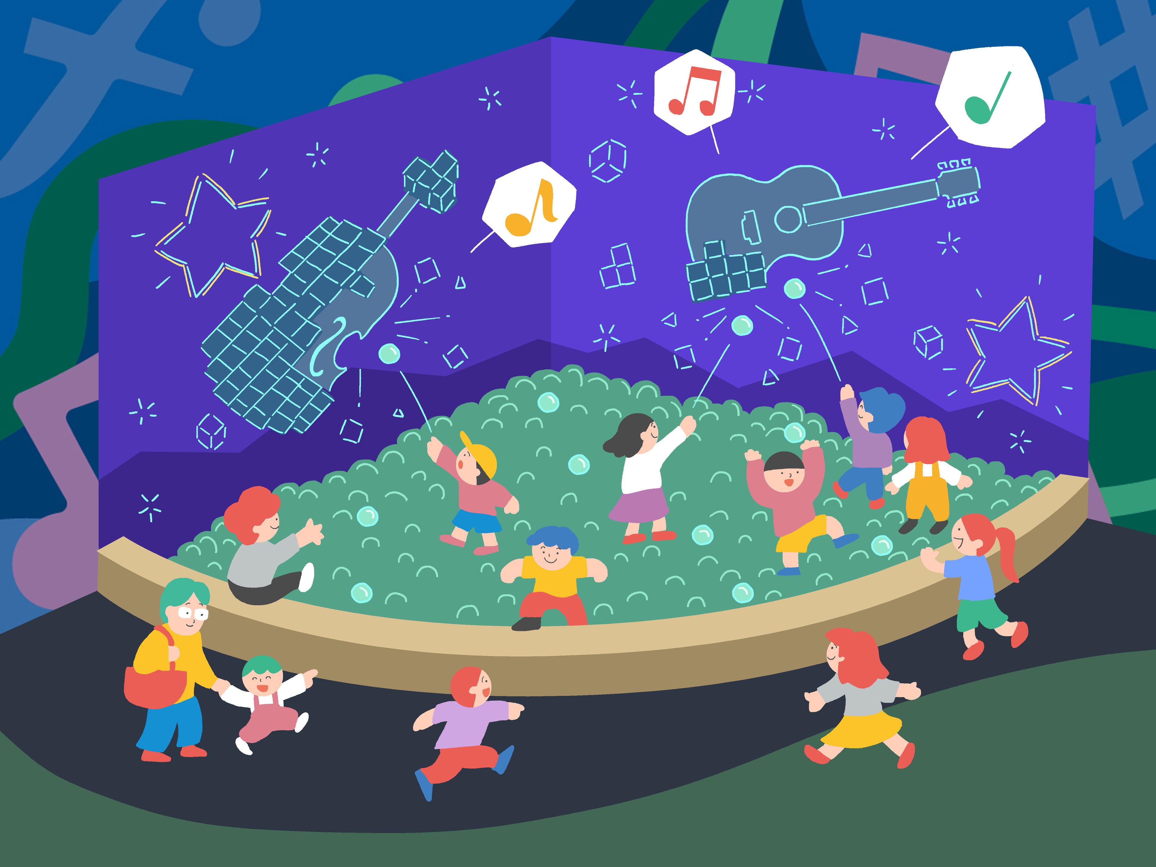音と光に包まれる、デジタルボールプール。スクリーンに投影されたキューブにボールを当てると、隠れていた楽器が姿を現し、楽しい音色が聞こえてきます。
