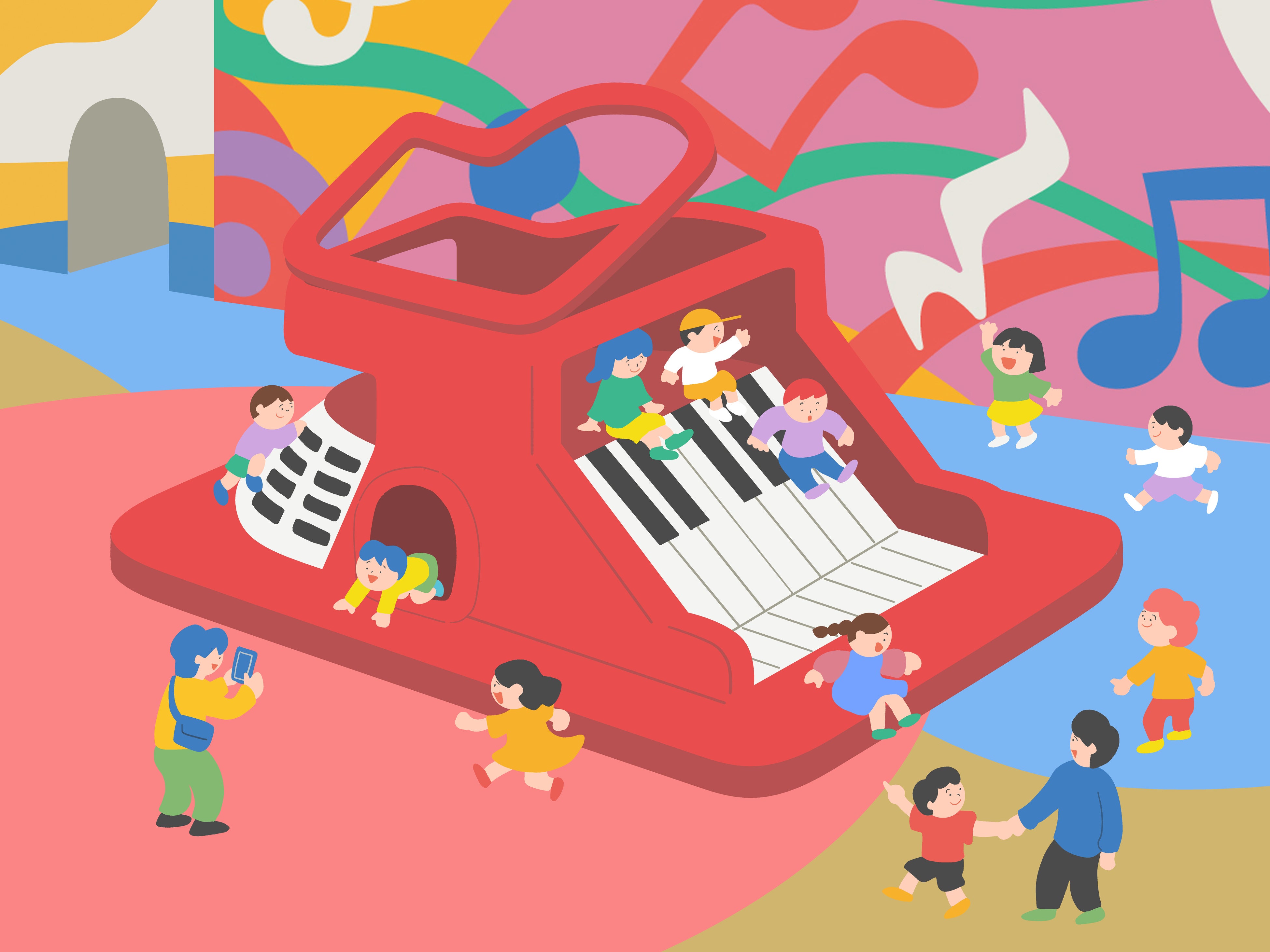のぼって、くぐって、すべりだす!全身で楽しむピアノのすべり台。
