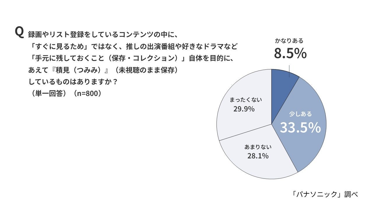 過去に「積見(つみみ)」コンテンツが溜まっていたことで、HDDの容量が足りずに困った経験があるかを聞いたところ、「かなりある」「少しある」を合わせると43.6%にのぼりました。一方で、「すぐに見るため」ではなく、推しの出演番組や好きなドラマなど「手元に残しておくこと(保存・コレクション)」自体を目的に、あえて「積見(つみみ)」(未視聴のまま保存)しているものがあるかを聞いたところ、「かなりある」「少しある」を合わせると42.0%が「ある」と回答。単なる見忘れではなく、作品への愛着からあえて残す「コレクション型積見層」が一定数存在し、春の新番組シーズンを前に、コンテンツを「消したいけれど消せない」ジレンマが浮き彫りになっています。