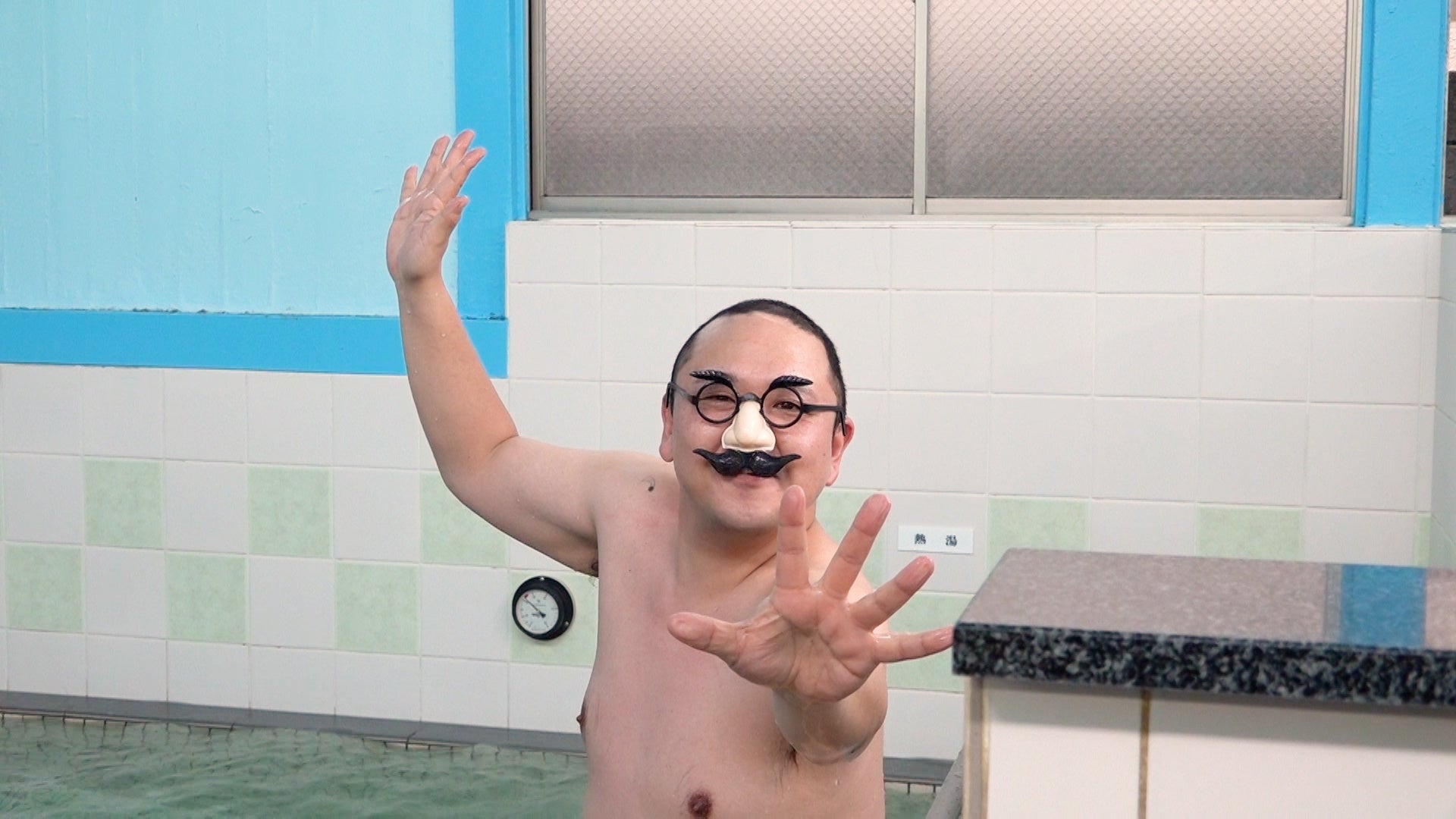 まずは江戸川区にある「武蔵湯」へ。こちらは、東京屈指の軟水の温泉が楽しめるとのこと。いざ浴室に入ると、なぜかおもちゃのメガネをかけた赤羽の姿が。東野は「どんだけ目立ちたいんですか!」とツッコミを入れますが、実は東野の悪だくみで……。