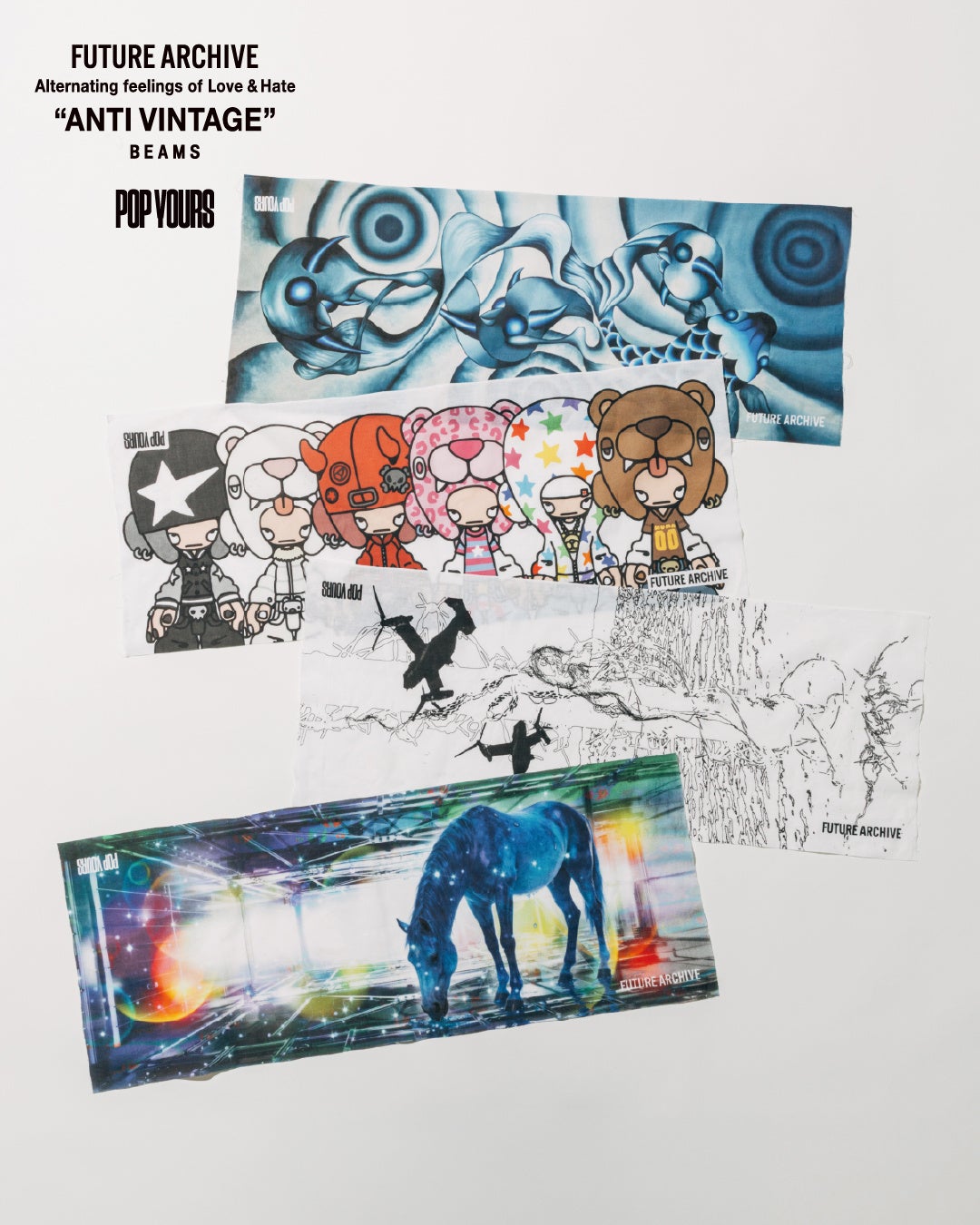 〈FUTURE ARCHIVE〉と『POP YOURS』のロゴを配置した限定フレームでの撮影をお楽しみいただけます。さらに撮影後、画面上で「当たり」が表示されたお客様には、〈FUTURE ARCHIVE〉と親交の深いアーティストたちがデザインを手がけた「会場限定特製手ぬぐい」をプレゼントいたします。