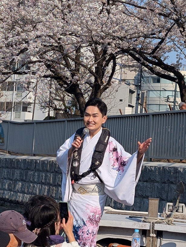 満開の見事な桜が川にせり出した中をくぐりながら、徐行できるところに差し掛かると、立ち上がって新曲「門前仲町の恋ざくら」を桜をバックに歌唱。川べりから見る方々にもその歌声を届けながら、こちらも初のシチュエーションに「たくさんの人に聴いていただけるのも嬉しいですね。」と語った。