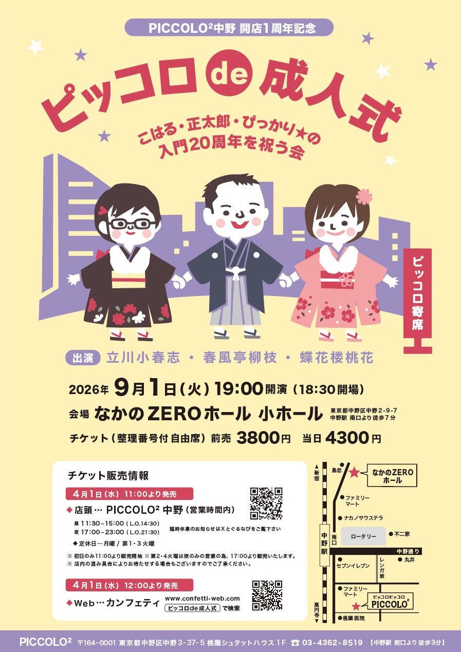 『ピッコロ de 成人式 〜こはる、正太郎、ぴっかり⭐︎の入門20周年を祝う会〜』が2026年9月1日 (火)になかのZERO 小ホール(東京都中野区中野2丁目9番7号)にて開催されます。
