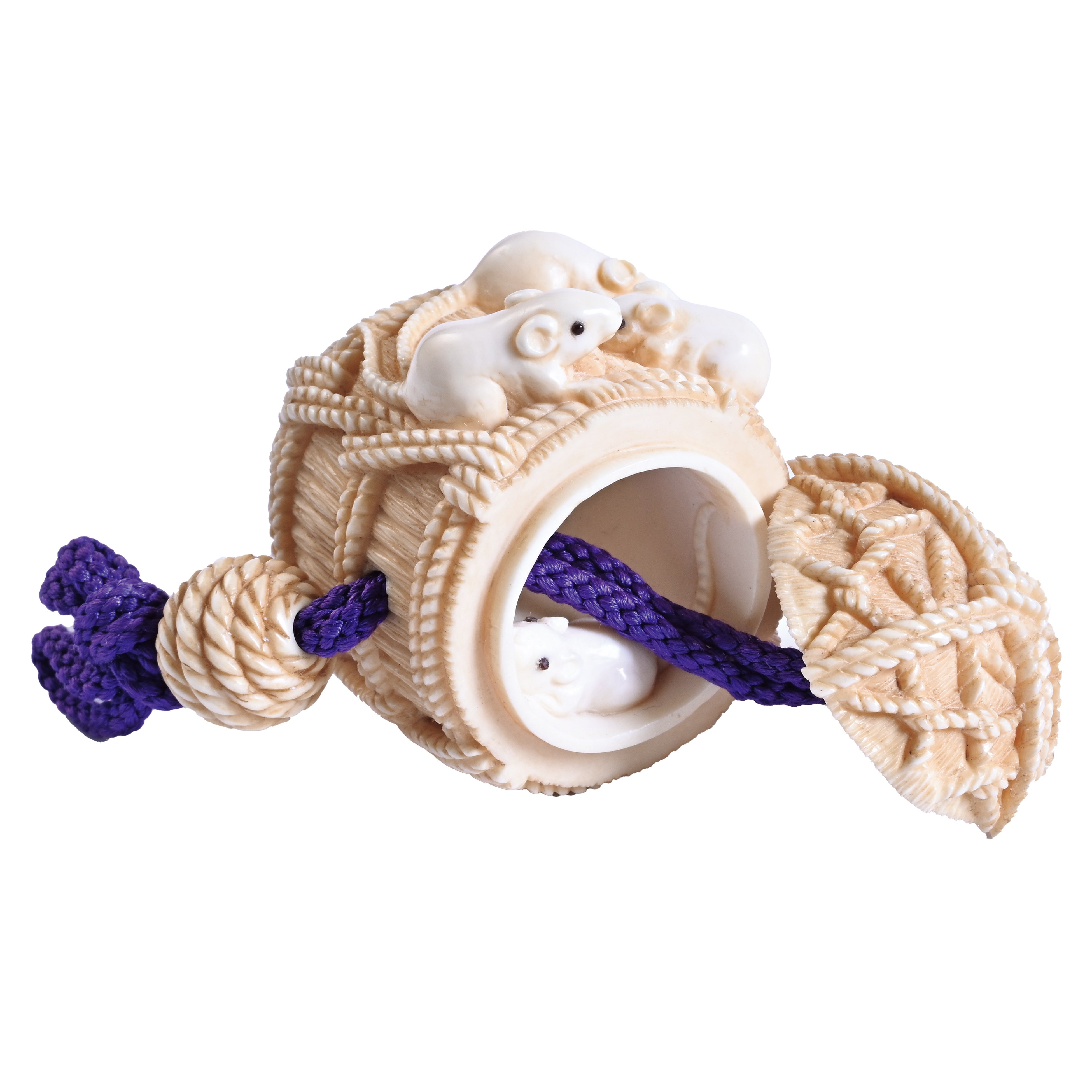 解説:大黒天の商売繁盛、金運上昇にあやかって、米俵に大黒天の使いである鼠を配した「俵ねずみ」の図柄は、五穀豊穣と子孫繁栄の願いが込められています。