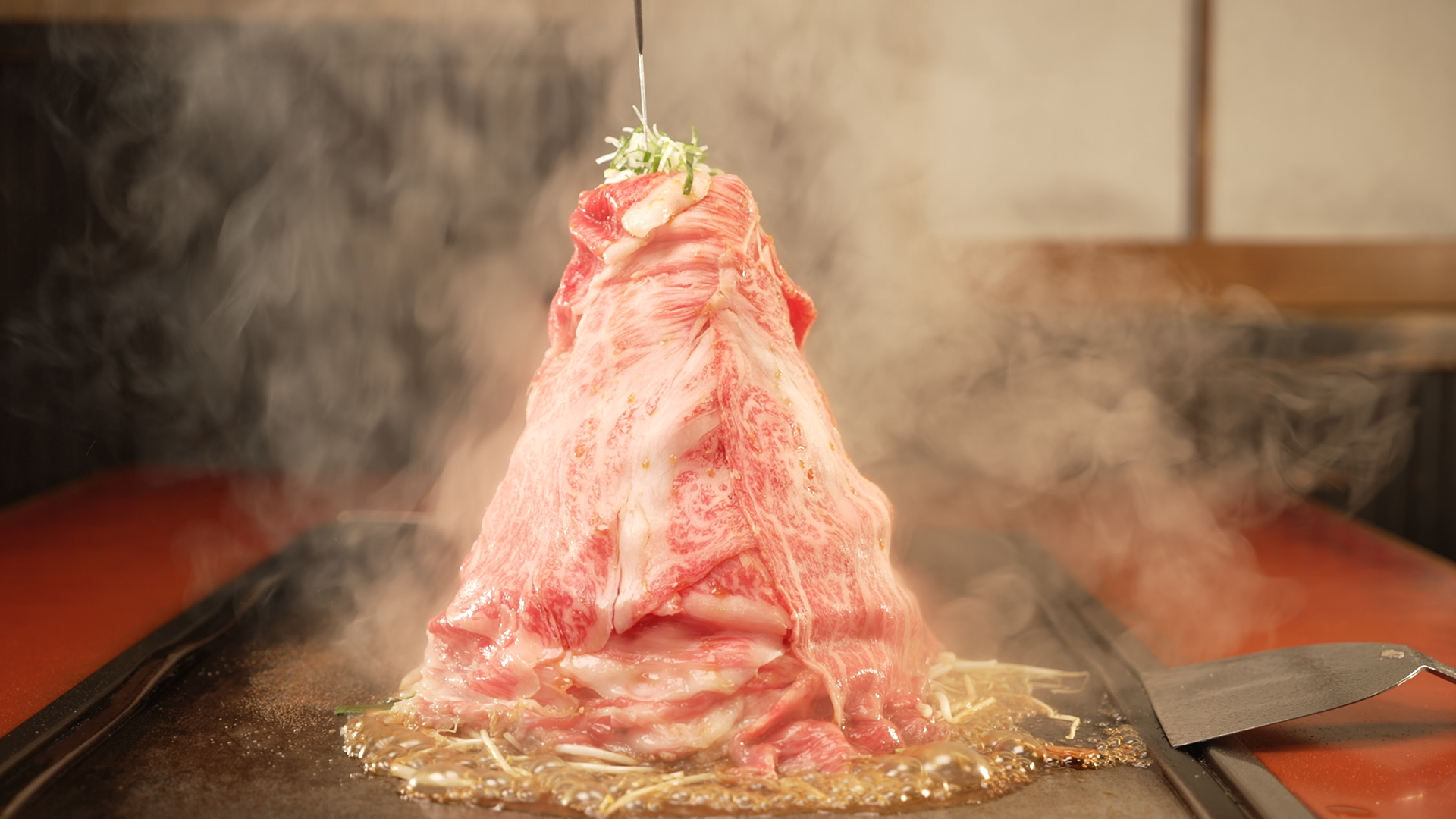 最高級A5ランクの和牛肩ロースを贅沢に使用し、鉄板で豪快に焼き上げるアツアツ茶色グルメに