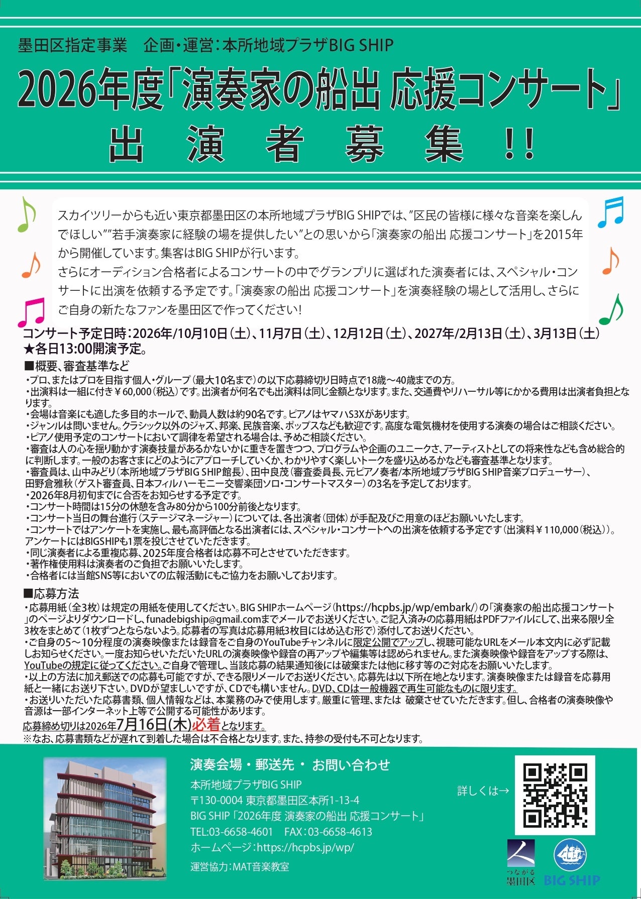 本所地域プラザ BIG SHIPでは、 “若手演奏家に経験の場を提供したい”、 “地域の方に様々な音楽を楽しんでいただきたい”という元ピアニスト・田中良茂氏(現・本所地域プラザBIG SHIP音楽プロデューサー)の発案を受けて、2015年より「演奏家の船出 応援コンサート」を開催しています。BIG SHIPはコミュニティ活動を行う拠点として墨田区本所に設置され、施設内には響きの良い多目的ホール、学び合い体験室、トレーニング室等が備わっています。建物の外観は船の帆のイメージから出来ていて、「演奏家の船出 応援コンサート」のネーミングもそこから発想されました。今回で11年目となる「演奏家の船出 応援コンサート」ですが、今では若い演奏者から熱い支持を受け、来場された多くのお客さまからも喜びの声を頂戴しています。