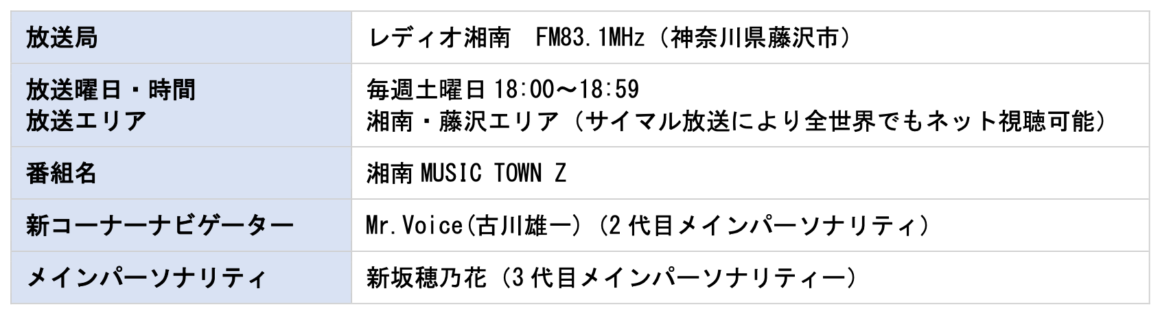 レディオ湘南・湘南MUSIC TOWN Z・メインパーソナリティー:新坂穂乃花・新コーナー担当:古川雄一’Mr.Voice’