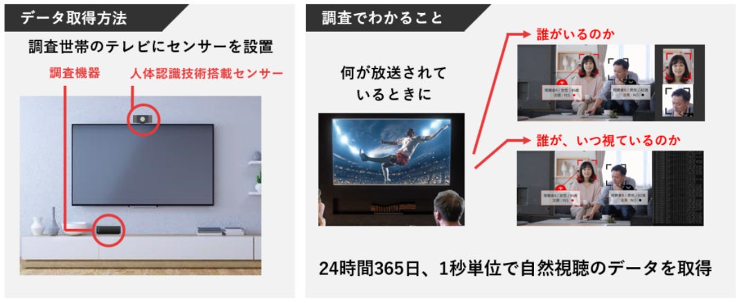 現在、国内では関東エリアの2,000世帯・関西エリア600世帯を調査対象とし、地上波の全番組の視聴データ、ならびにコネクテッドTVの注視データを提供しています。