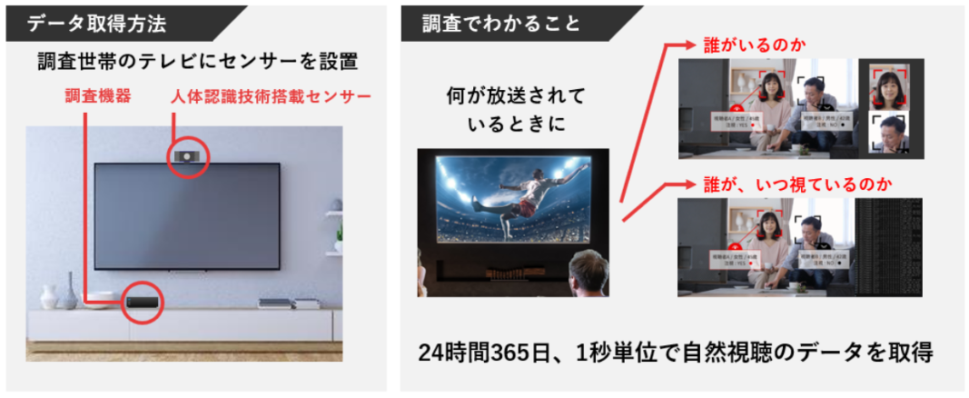 REVISIOでは、独自開発した人体認識センサーを一般家庭のテレビの上に設置し、調査参加者の視聴態勢を毎秒で自動的に取得しています。これによりテレビの前にいる個人を特定し、その人がテレビ画面に目線を向けているか(注視しているか)がわかります。