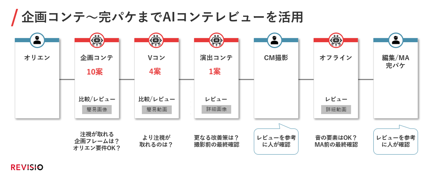 本CMは、俳優の中沢元紀さんを起用し、これまでREVISIOが取得してきた約14万本分のCMデータをもとに「注視される要素」を盛り込んだ内容に仕上がっています。なお、本CMの制作においては、REVISIOが提供する「AIコンテレビュー」を、企画の立案から最終編集に至るまでの全工程で活用いたしました。