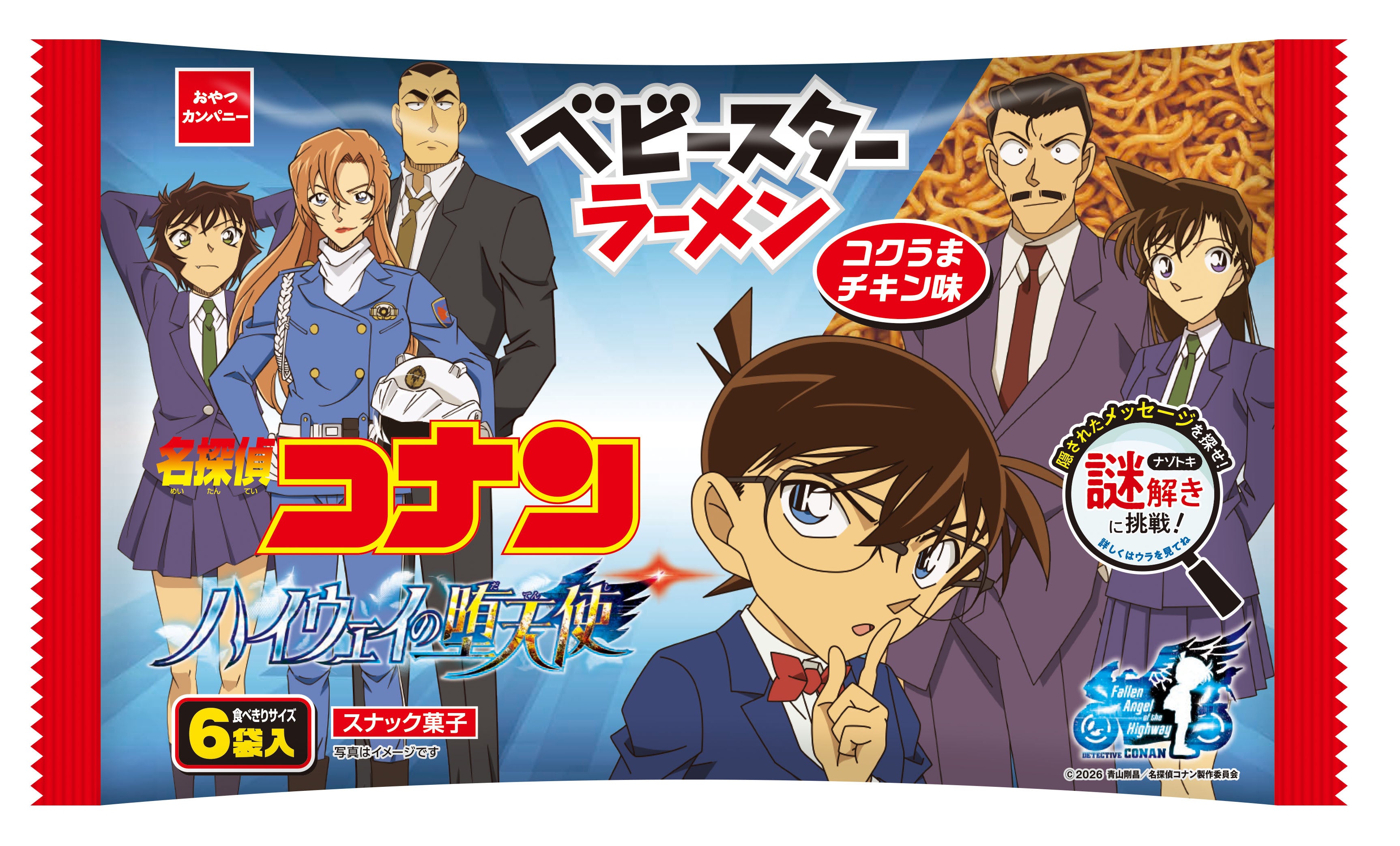 株式会社おやつカンパニー(本社所在地:三重県津市 代表取締役社長:横山正志)は、劇場版最新作『名探偵コナン ハイウェイの堕天使』とのコラボ商品として『名探偵コナン ハイウェイの堕天使×ベビースターラーメン(コクうまチキン味)6袋入』を、2026年4月13日(月)より、全国にて期間限定で発売します。2026年4月10日公開の劇場版『名探偵コナン ハイウェイの堕天使』にも登場するキャラクターが描かれた全4種類の個包装パッケージや外装パッケージにはナゾトキ付き!君は隠されたメッセージを探し出せるか⁉真実はいつもひとつ!