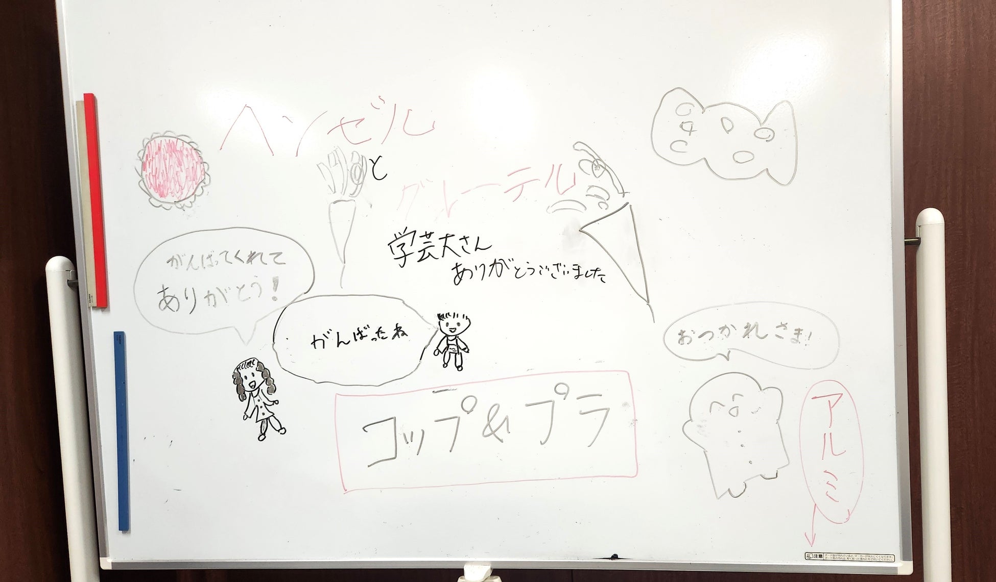終演後には、参加の子どもたちと保護者の皆様、キャスト、公演に関わった東京学芸大学と私どものスタッフで、懇親会を開催しました。子どもたちが準備を手伝ってくれ、ホワイトボードにはこんなメッセージを残してくれました。