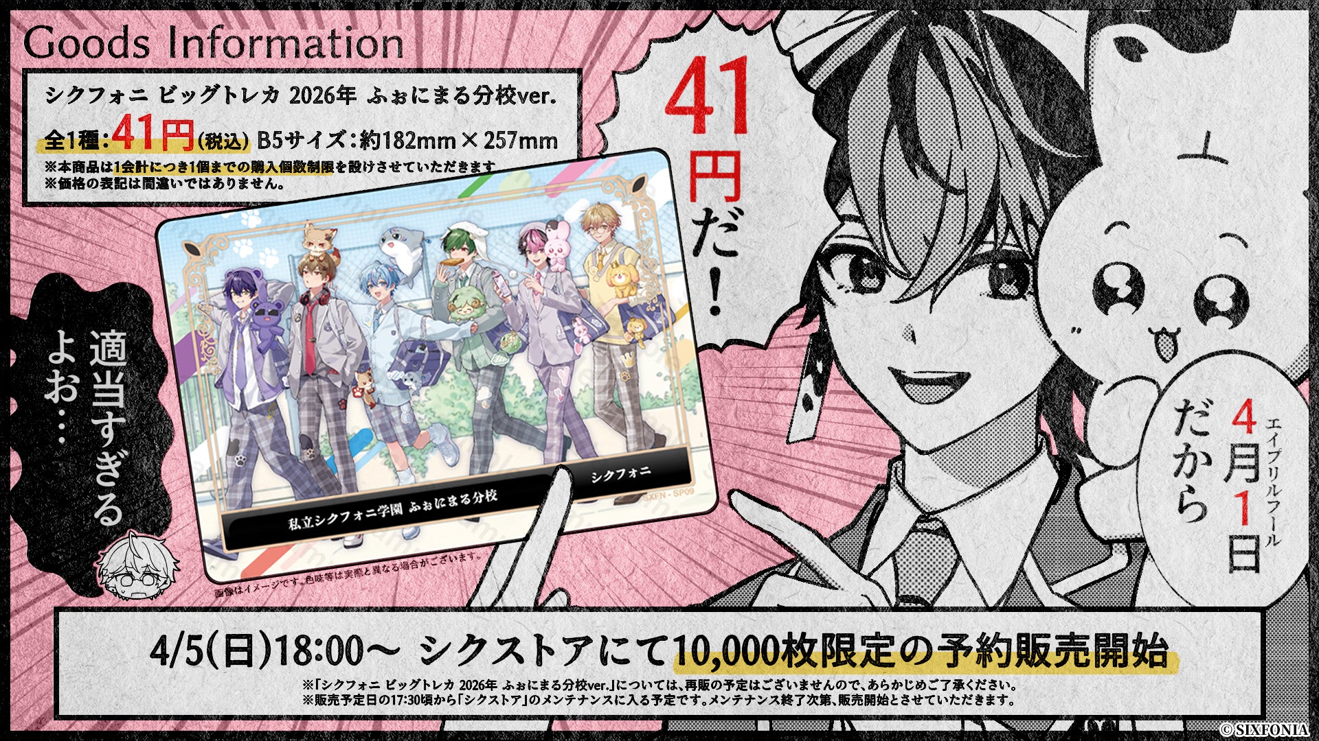 さらに本企画の象徴的なアイテムとして、「シクフォニビッグトレカ」が登場いたしました。B5サイズの特大仕様というインパクトに加え、エイプリルフールにちなんだ“41円”という価格で販売されます(数量限定)。視覚的なインパクトと価格のギャップが際立つ、思わず二度見してしまうようなユニークなアイテムとなっています。