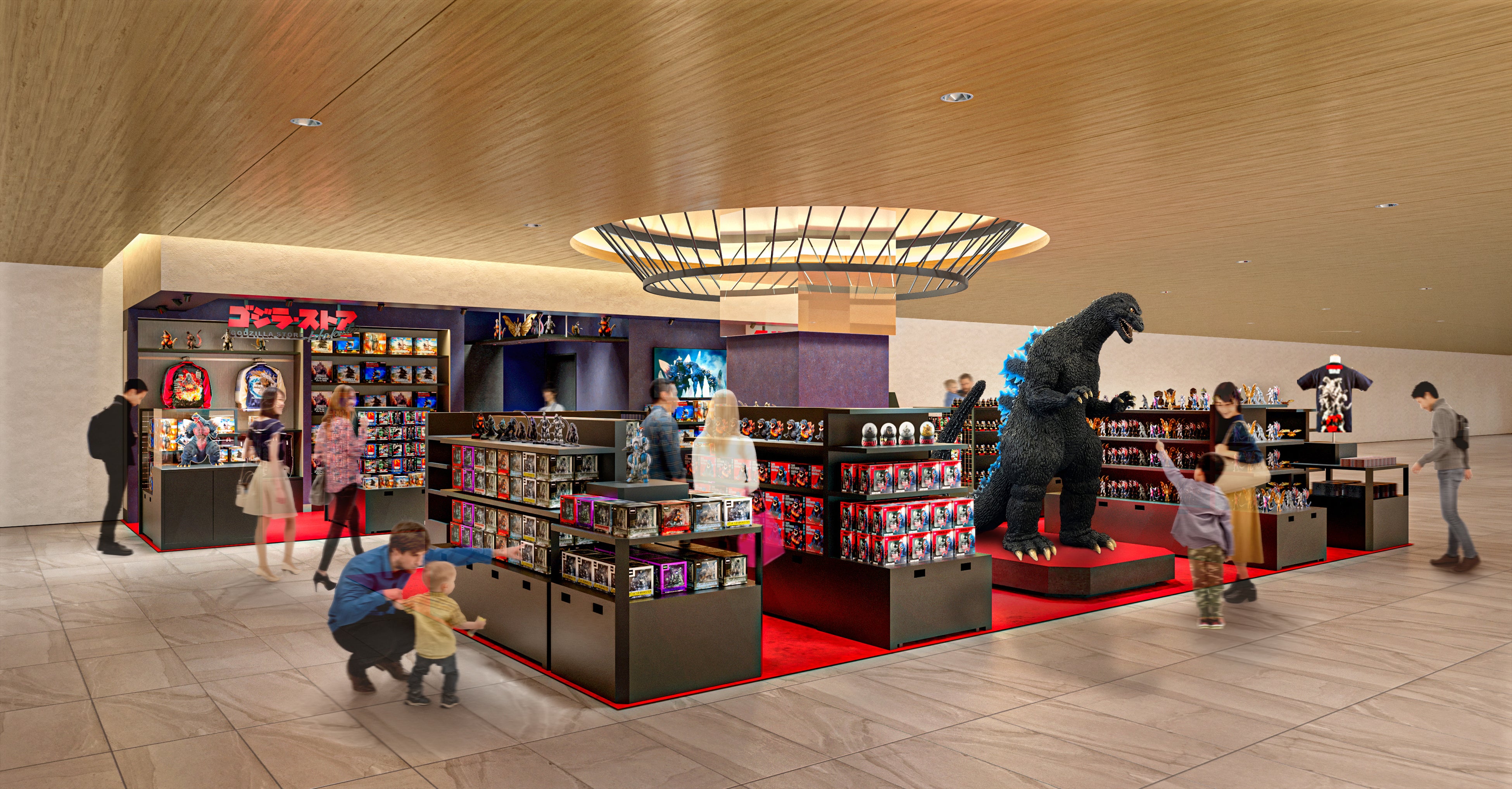 ①店内パースを大公開!約2mのゴジラ巨大スタチューがお出迎え!
