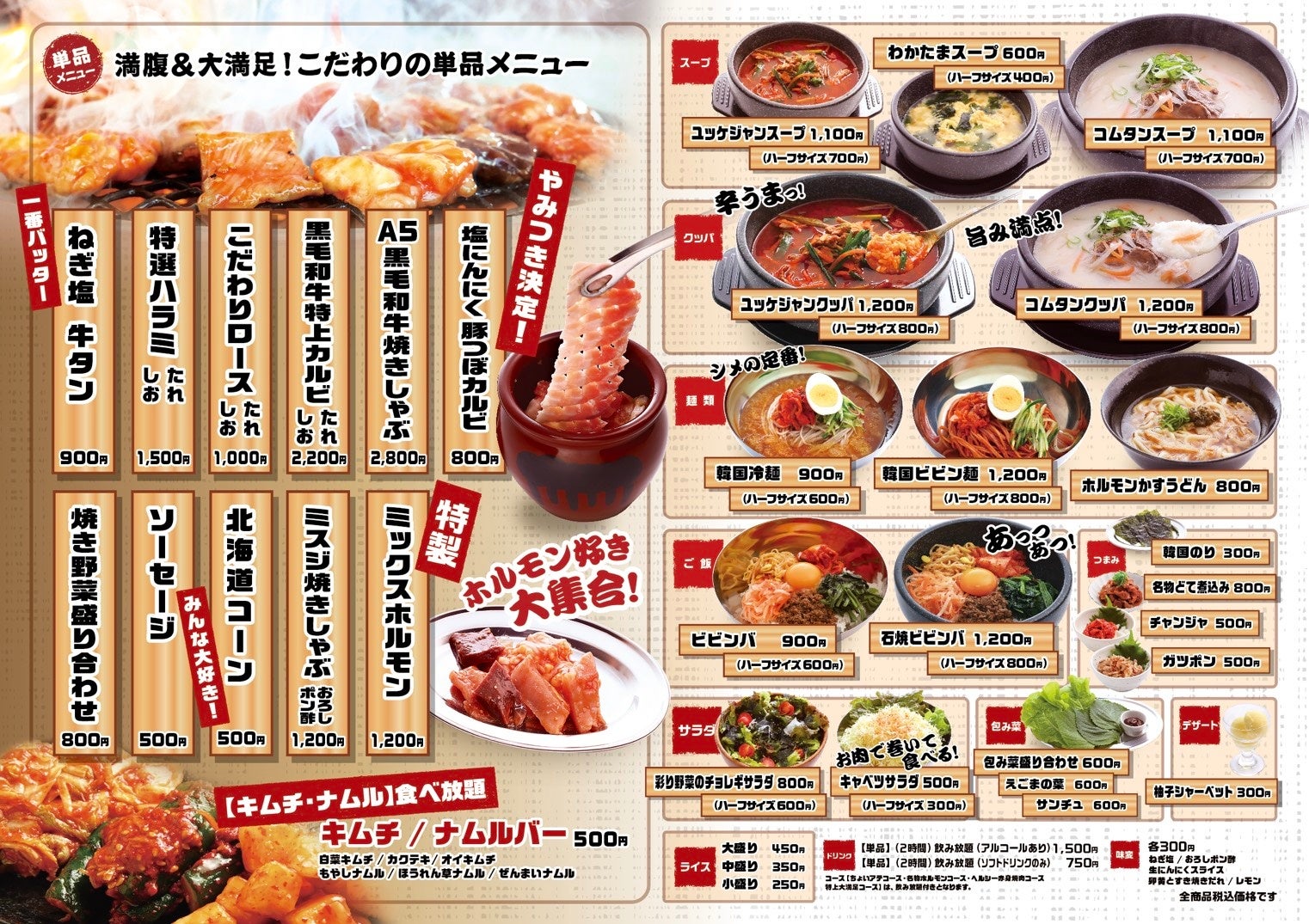 また、単品メニューも豊富に取り揃えており、コース利用に限らず、個別でのご注文にも対応しております。昭和レトロな雰囲気の中で、懐かしさを感じながら焼肉をお楽しみいただけます。