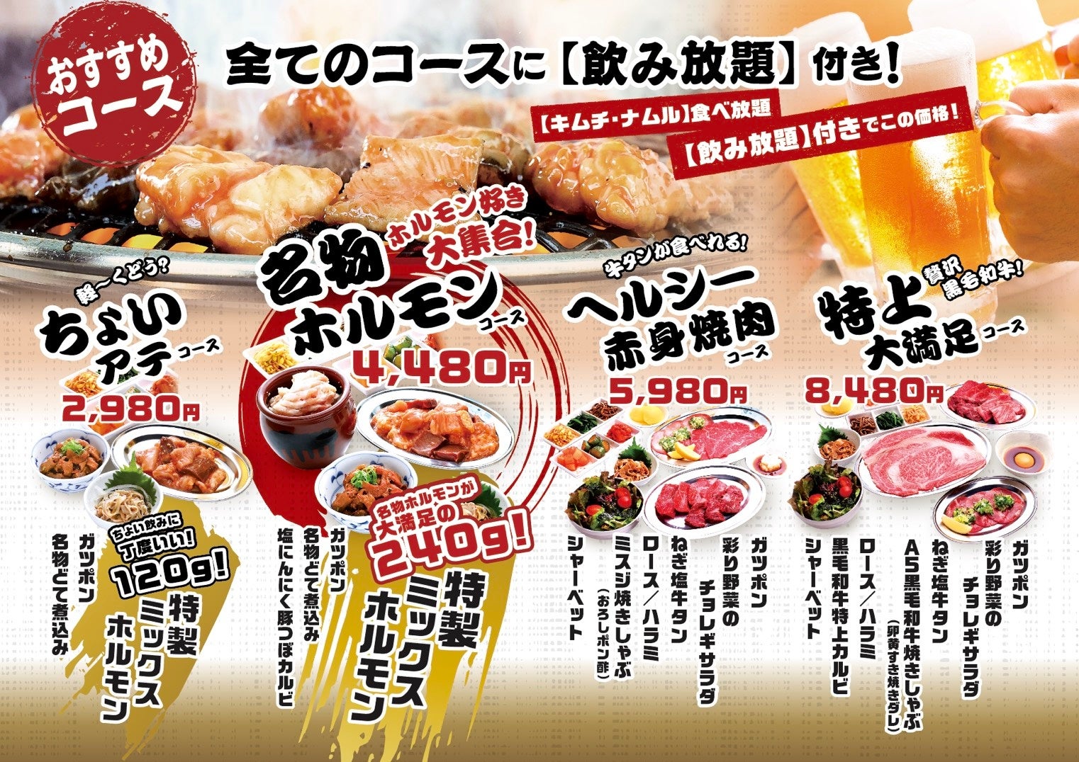 本施設では、全4種類のコースをご用意しておりますが、中でも、名物ホルモンコース(4,480円)は、ホルモンを中心に構成した定番メニューとして、多くのお客様にお楽しみいただける内容となっております。