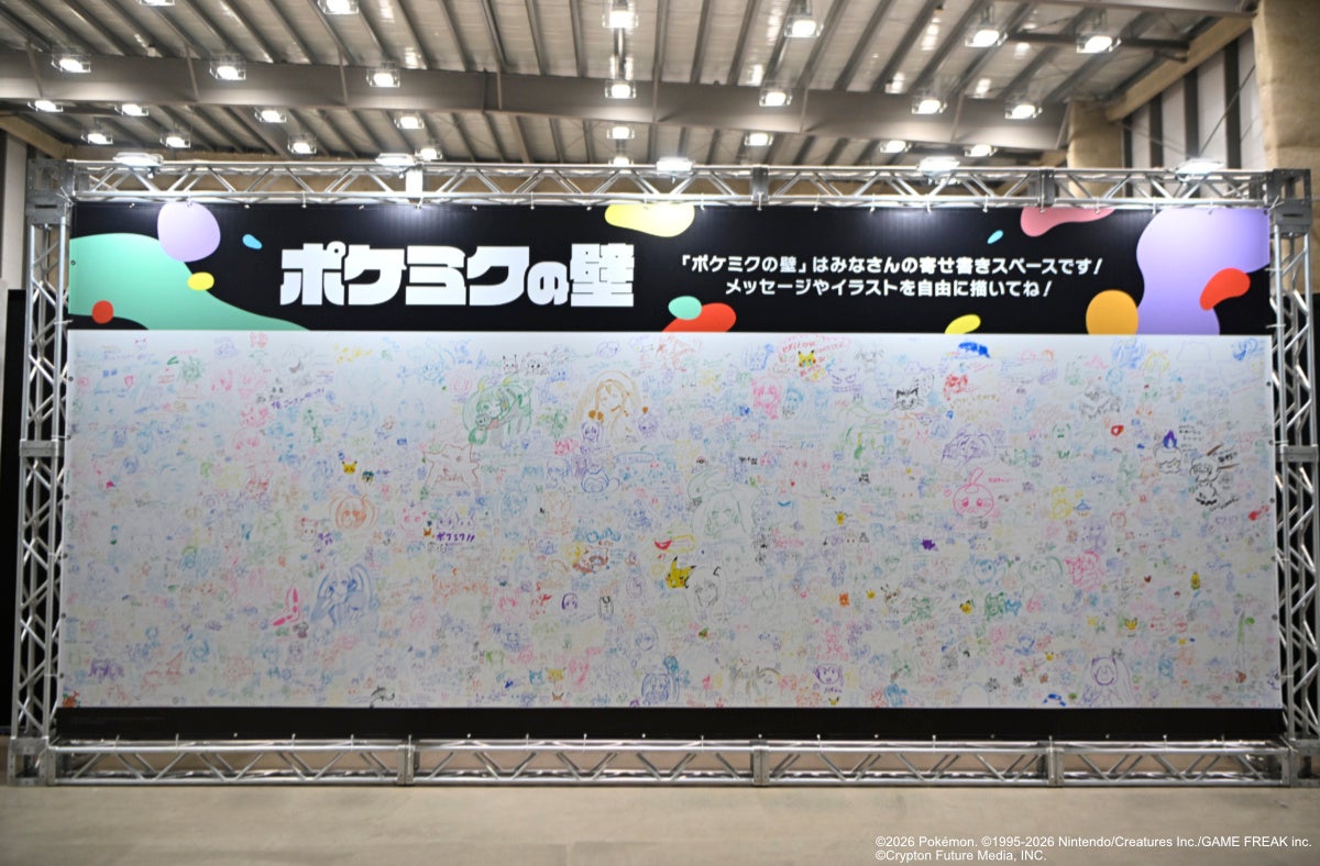 また、サブアリーナではポケモンセンターのオリジナル商品を購入できる販売コーナーが設けられたほか、これまでに「ポケミク」で生まれた音楽・イラストを紹介するギャラリーや、フォトスポットなどがある展示コーナーも展開。訪れた人が自由にイラストやコメントを書き込める“ポケミクの壁”には、両コンテンツのファンアートがたくさん描き込まれました。