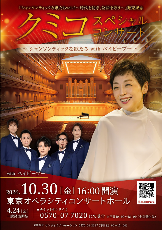 彼女が自身の歌唱を通し、あらゆるジャンルの楽曲を「シャンソン的(シャンソンティック)」な解釈で再定義するコンセプト・アルバムの第2 弾『シャンソンティックな歌たち Vol.2 時代を紡ぎ、物語を歌う』が5 月27 日に発売されるが、この最新アルバムのリリースを記念し、10 月30 日(金)に東京・初台の東京オペラシティ コンサートホールにて公演を開催することが決定した。本公演はアルバムリリースを記念した全国ツアーのハイライトとなり、最新アルバムの楽曲を中心に、クミコの真骨頂であるドラマチックなステージを展開する。
