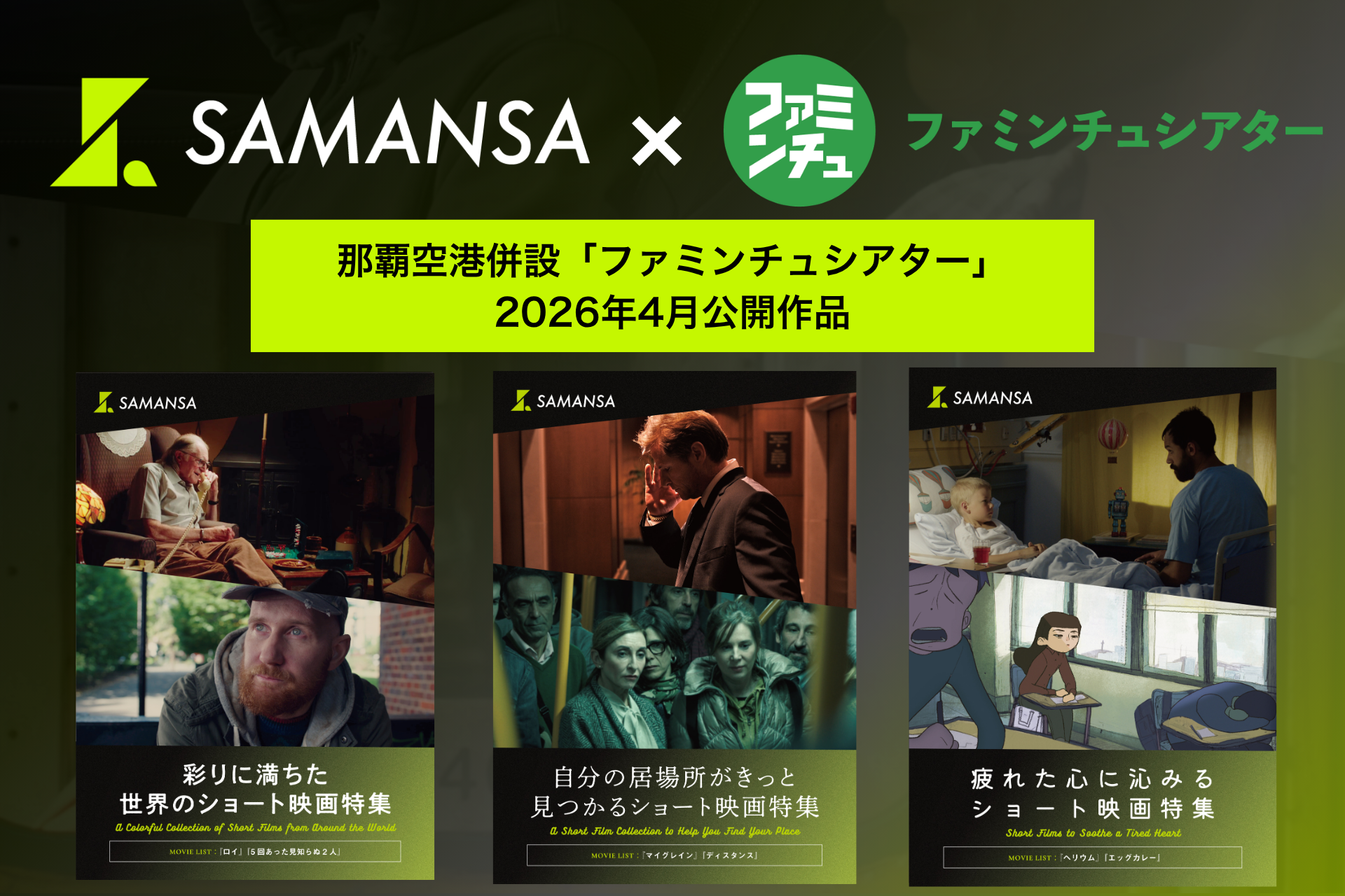 株式会社SAMANSA(本社:東京都渋谷区、代表取締役社長:岩永 祐一、共同代表:遠山 孝行)は、有限会社チャオジャパントレーディング(本社:沖縄県那覇市、代表取締役社長:洲鎌 一馬)が那覇空港で展開する「ファミンチュシアター」において4月1日(水)より、新たな作品を公開することをお知らせいたします。今月は『彩りに満ちた世界のショート映画特集』『自分の居場所がきっと見つかるショート映画特集』『疲れた心に沁みるショート映画特集』の3パッケージ、計6本を公開。