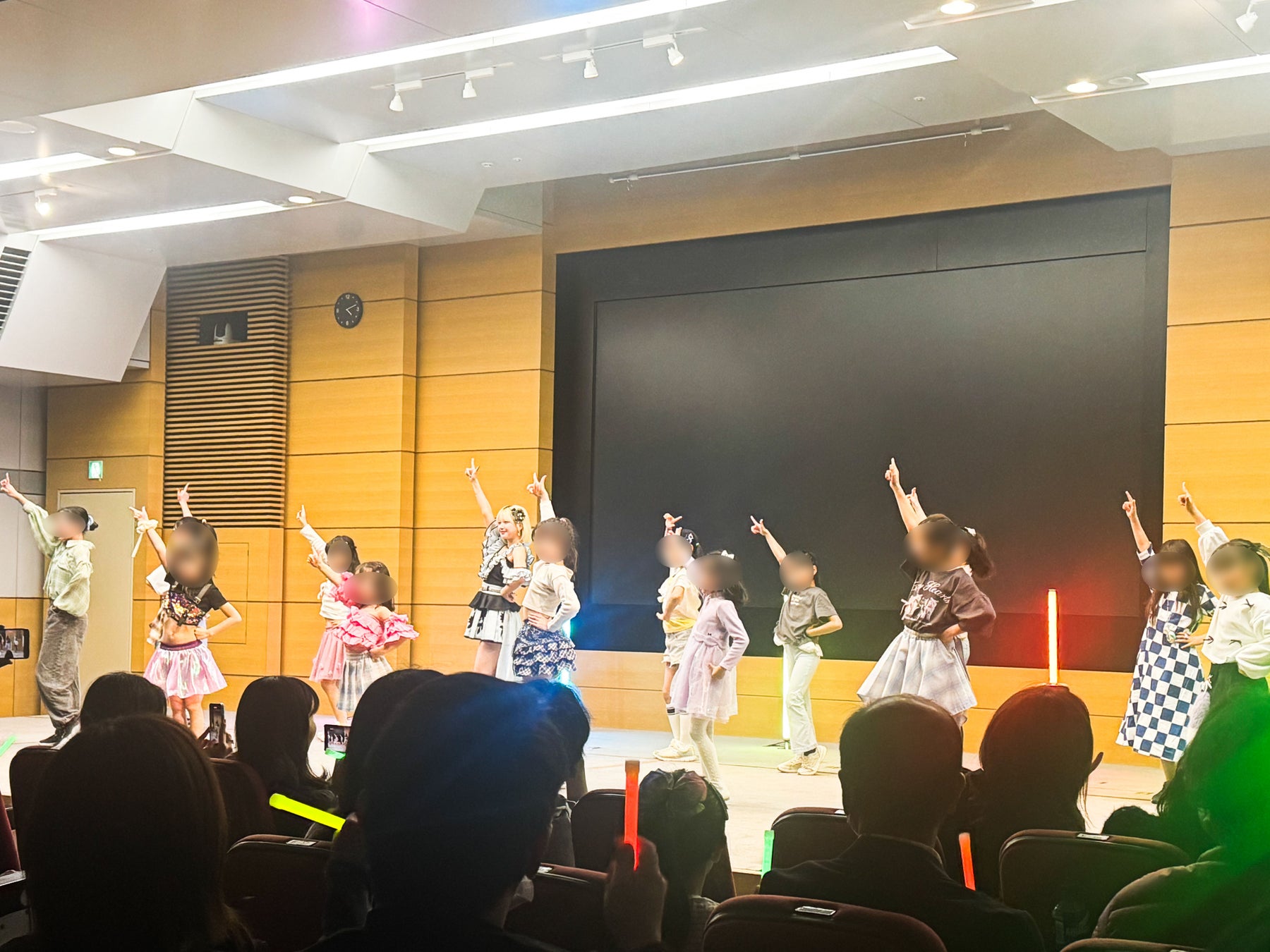 レッスン後には、アイドルと一緒にステージへ登場し、観客の前で堂々としたパフォーマンスを披露。観覧していた社員や保護者からは大きな拍手が送られ、会場は大きな拍手と笑顔に包まれました。