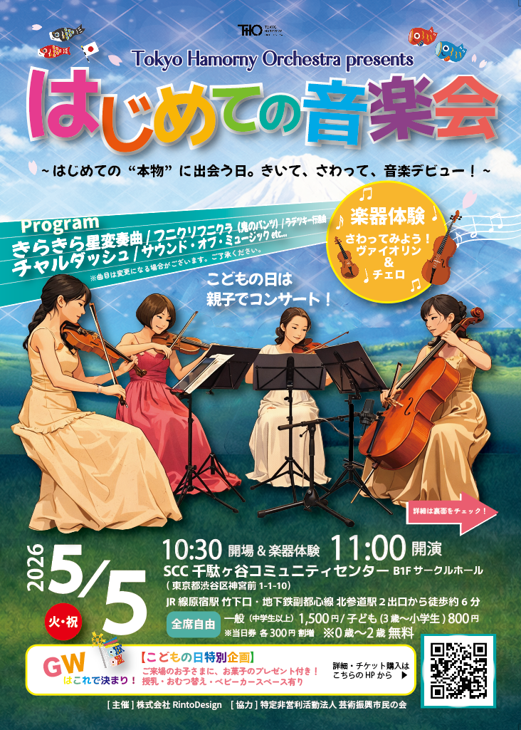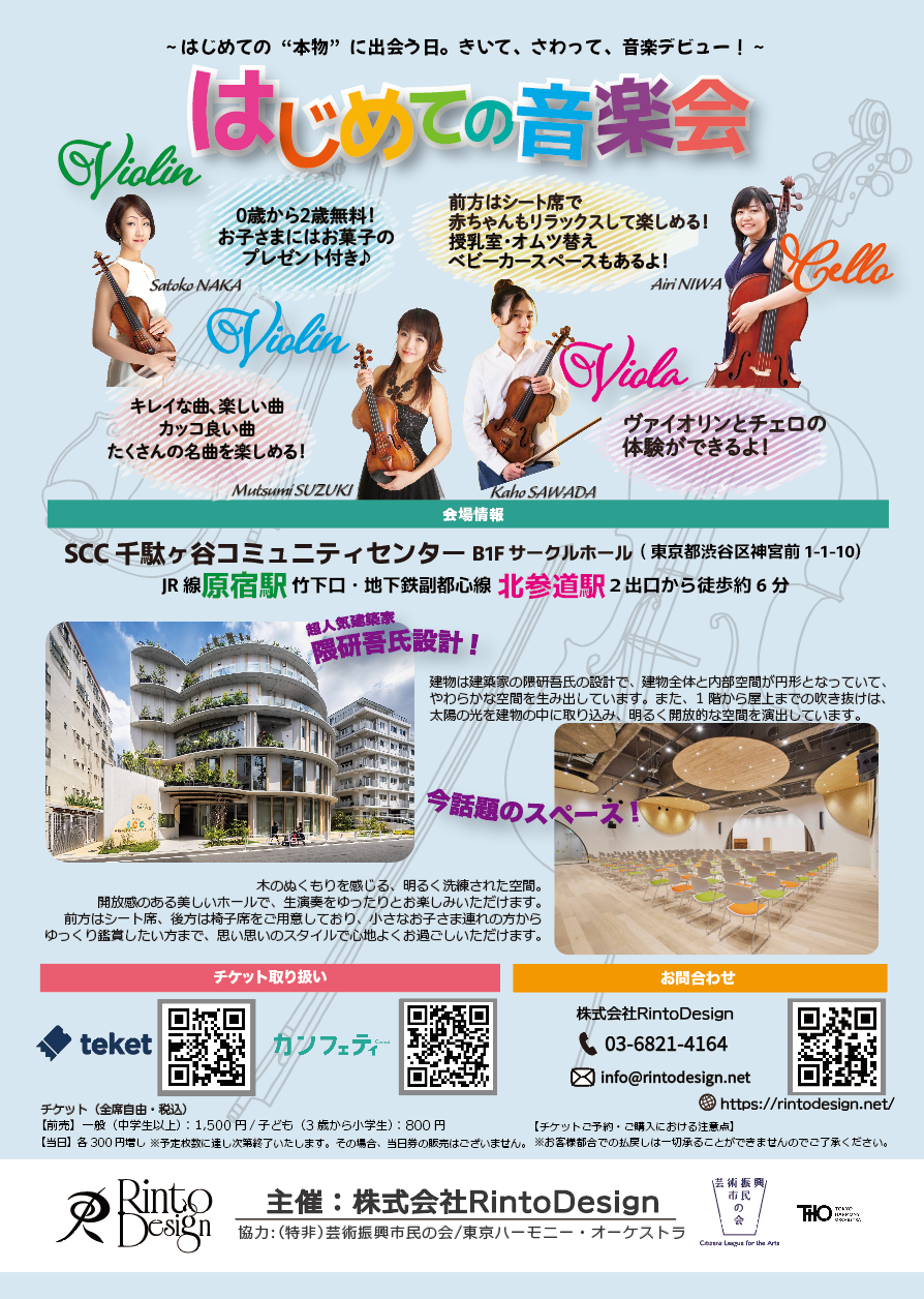 株式会社RintoDesignは、2026年5月5日(火・祝)、SCC千駄ヶ谷コミュニティセンターにて、親子で楽しめるクラシックコンサート「はじめての音楽会」を開催いたします。
