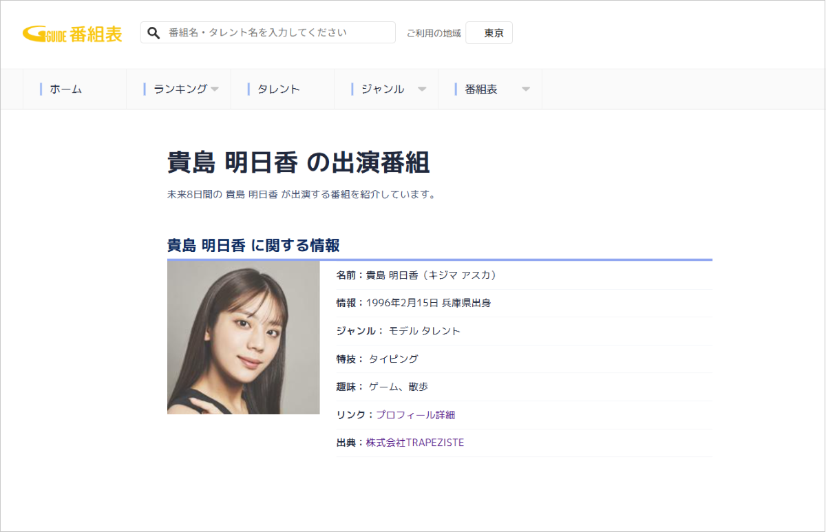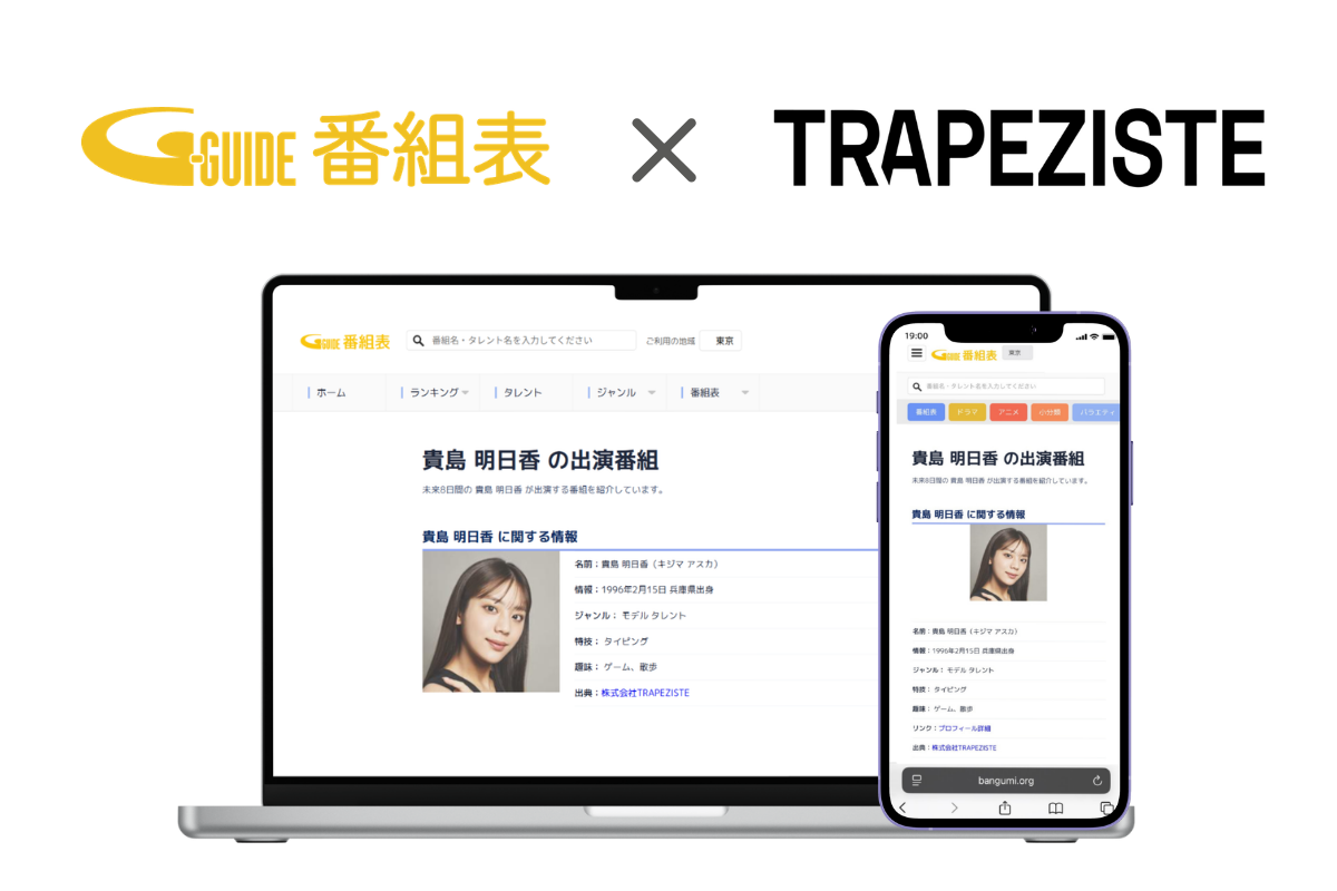 この度、TRAPEZISTEより、所属タレントのプロフィールデータのご提供を受け、「Gガイド」にてタレントの画像や詳細な公式プロフィール情報の表示を開始しました。