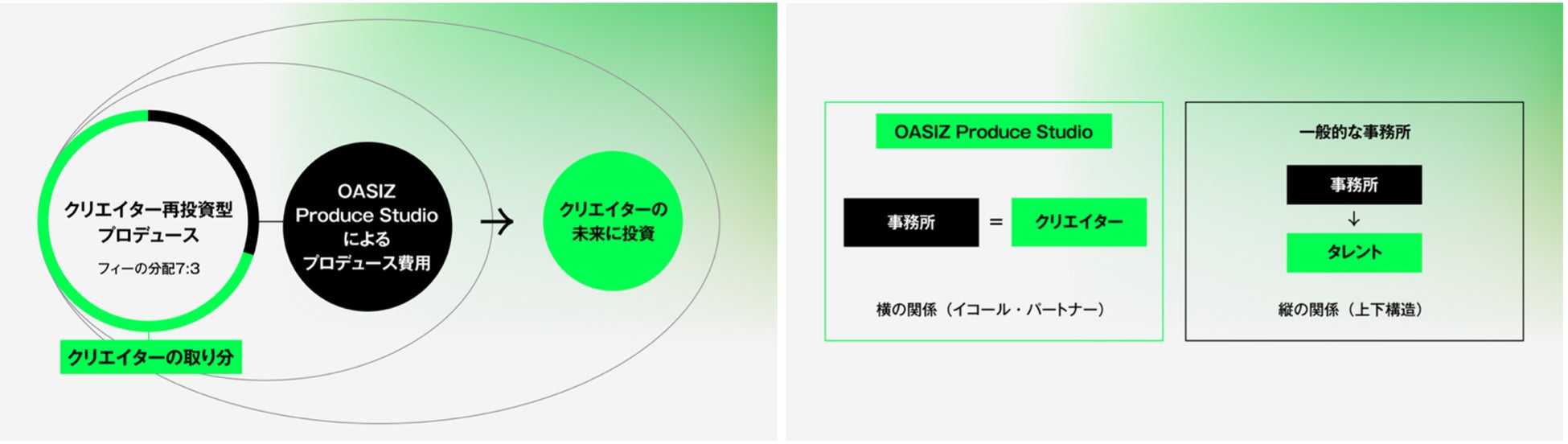 元々、事務所は絶対作らないと決めていたのですが、クリエイター個人の価値を中長期的に拡張していくためには、構造そのものを見直す必要があると感じていました。クリエイターを管理するのではなく、対等なパートナーとして共にビジネスを創るプロジェクトとして立ち上げたのが「OASIZ Produce Studio」です。