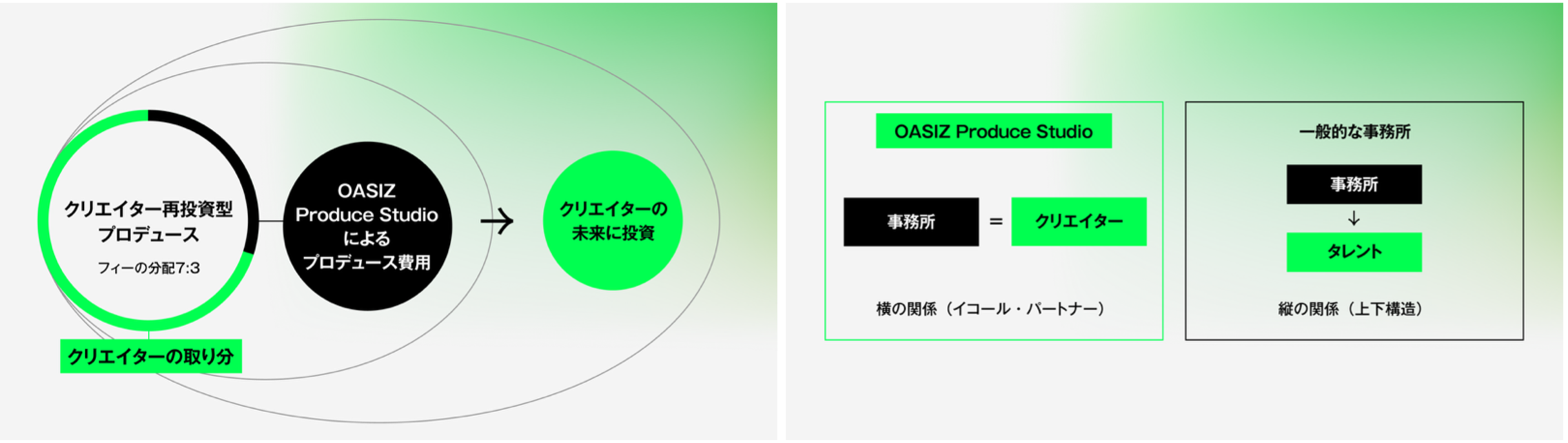元々、事務所は絶対作らないと決めていたのですが、クリエイター個人の価値を中長期的に拡張していくためには、構造そのものを見直す必要があると感じていました。クリエイターを管理するのではなく、対等なパートナーとして共にビジネスを創るプロジェクトとして立ち上げたのが「OASIZ Produce Studio」です。