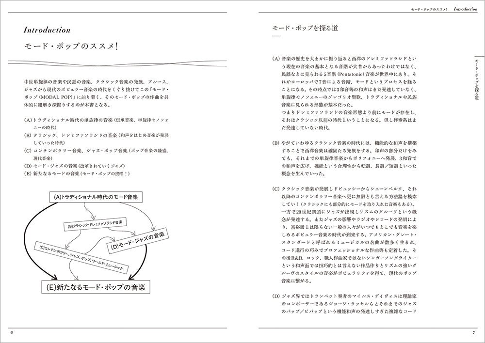 本書では、ドミナント・モーションを基軸とした「解決」へと向う作曲行為へのオルタナティブとして、「モード」を使用した独特の浮遊感や空間感覚を有するポップス=「モード・ポップ」という概念を創出、作曲家への参加を呼びかけます。古来の単旋律音楽に見られたモード音楽が、平均律以降の機能和声の発展、ジャズにおけるモードの発見を経て、いよいよポピュラーミュージックに導入されることになりました。