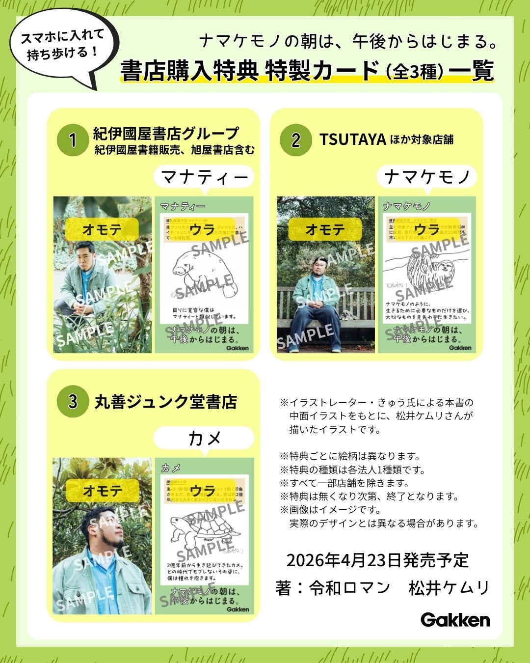 本書の発売を記念して、書店で購入された方限定で、特製カードをプレゼントいたします。カードの表には本書の制作にあたって撮影されたケムリさんの「撮りおろし写真」、裏には本書に登場する動物を図鑑形式で掲載。さらに、ケムリさんの「手描き動物イラスト」※が印刷されています。縦8.5cm×横5.4cmのスマホケースに入るサイズです。