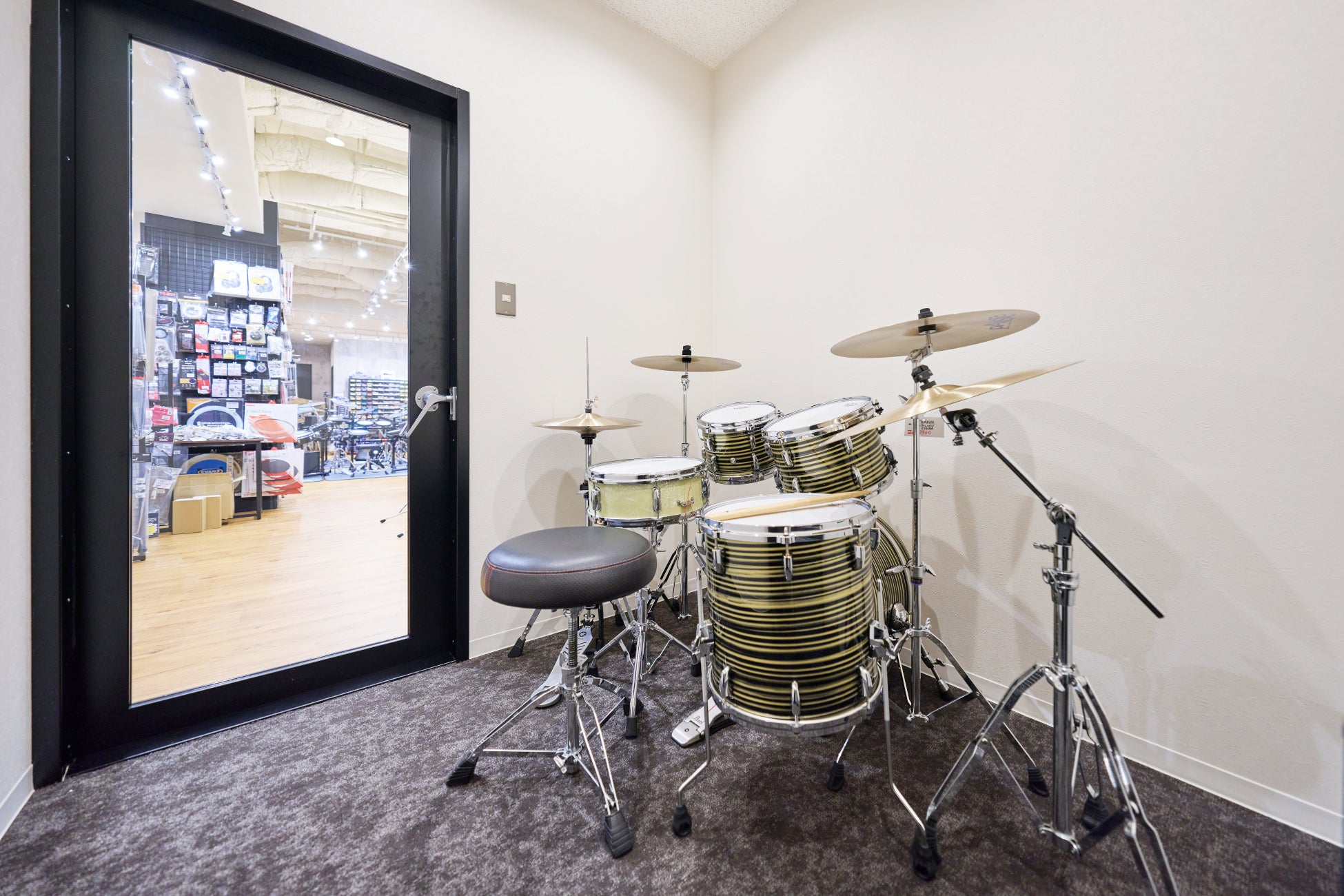 大小の試奏ブースを設け、ドラムセットやアンプを実際に鳴らしながら試奏できる環境を整備。音や演奏感を確かめながら、納得して楽器を選んでいただけます。