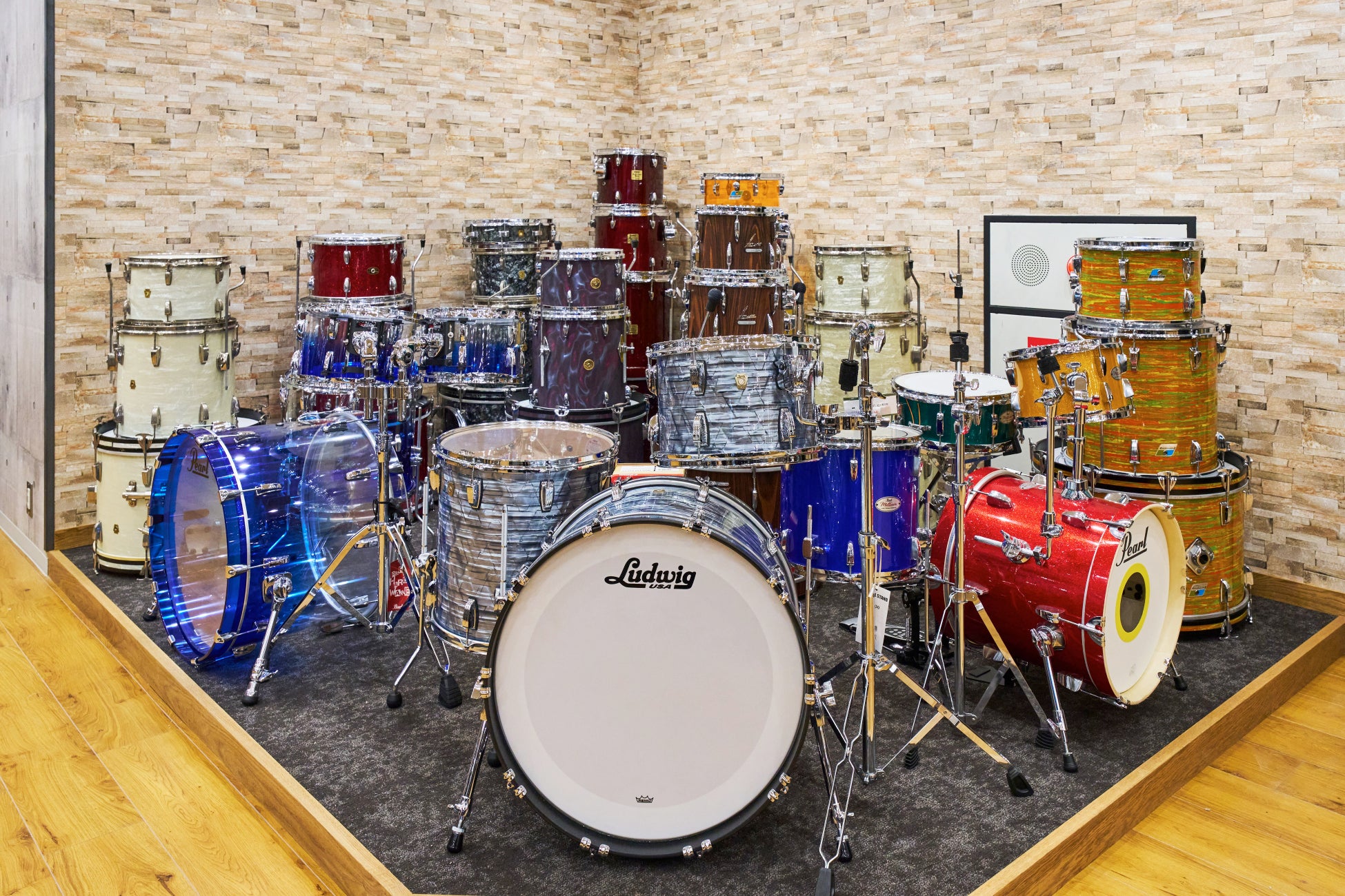 ドラムセット約20セットを展示