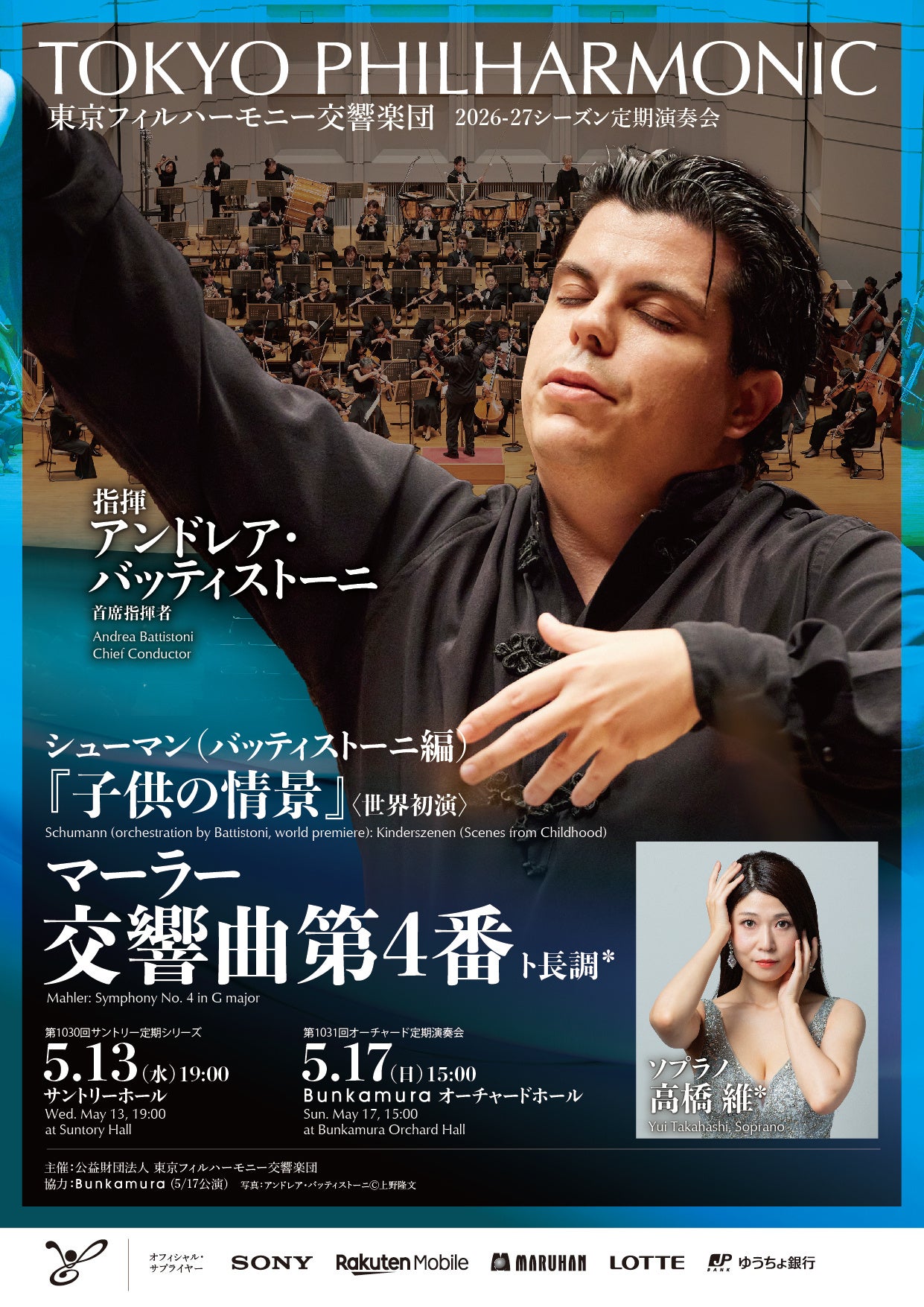 2026年5月の東京フィル定期演奏会(5月13日・17日)では、首席指揮者アンドレア・バッティストーニが登場。19世紀ドイツ・オーストリアを代表する二人の作曲家、ローベルト・シューマンとグスタフ・マーラーの作品を取り上げます。