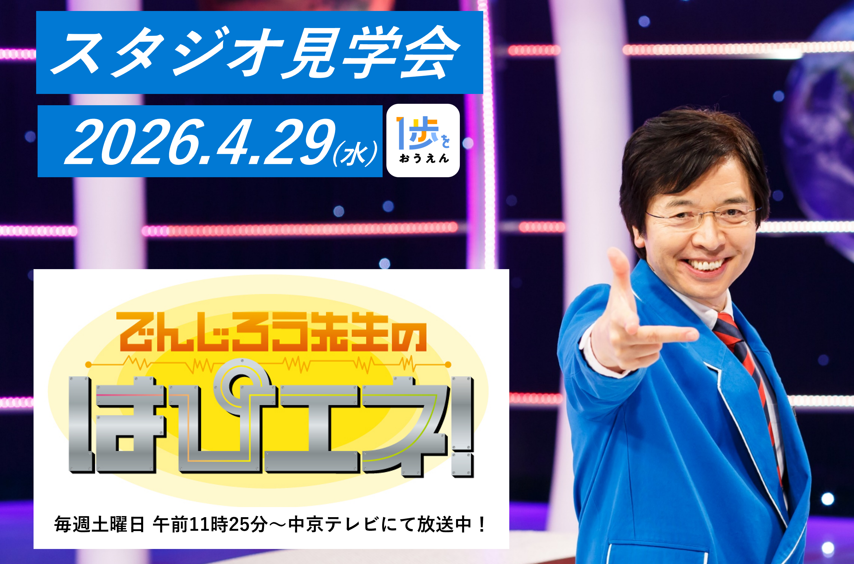 中部電力では、未来を担う子どもたちが勇気を出して踏み出す「1歩」を応援する「一歩応援プロジェクト」を実施しています。その一環として、中京テレビとタイアップした好評企画、「でんじろう先生のはぴエネ!」スタジオ見学会を4月29日(水曜・祝日)に開催します。