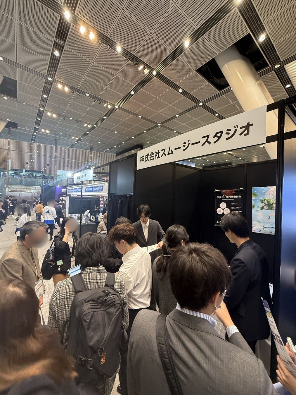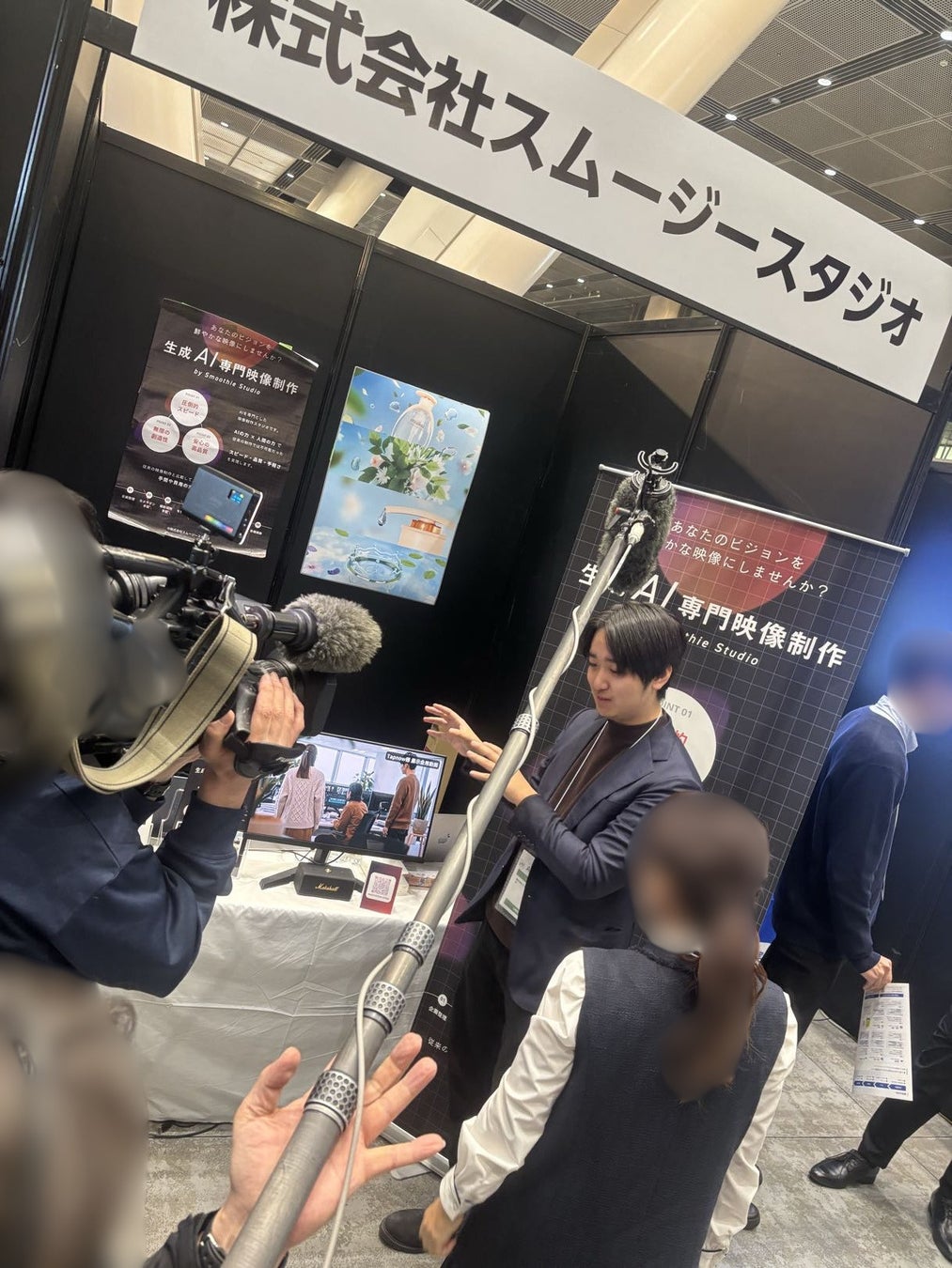 会場では、スムージースタジオが展開する生成AI専門映像制作の取り組みを中心に、制作事例や活用イメージを紹介。ブースでは、来場者へのデモンストレーションや個別説明を行い、生成AIによる映像制作の可能性と、実務における活用方法について発信しました。