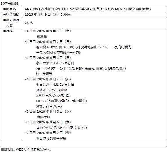 ANA X株式会社(代表取締役社長:神田 真也、本社:東京都中央区)は、「ANAで旅する 小田井涼平 LiLiCoと巡る 暮らすように旅するストックホルム7日間<羽田発着>」を、2026年4月9日(木)より発売します。