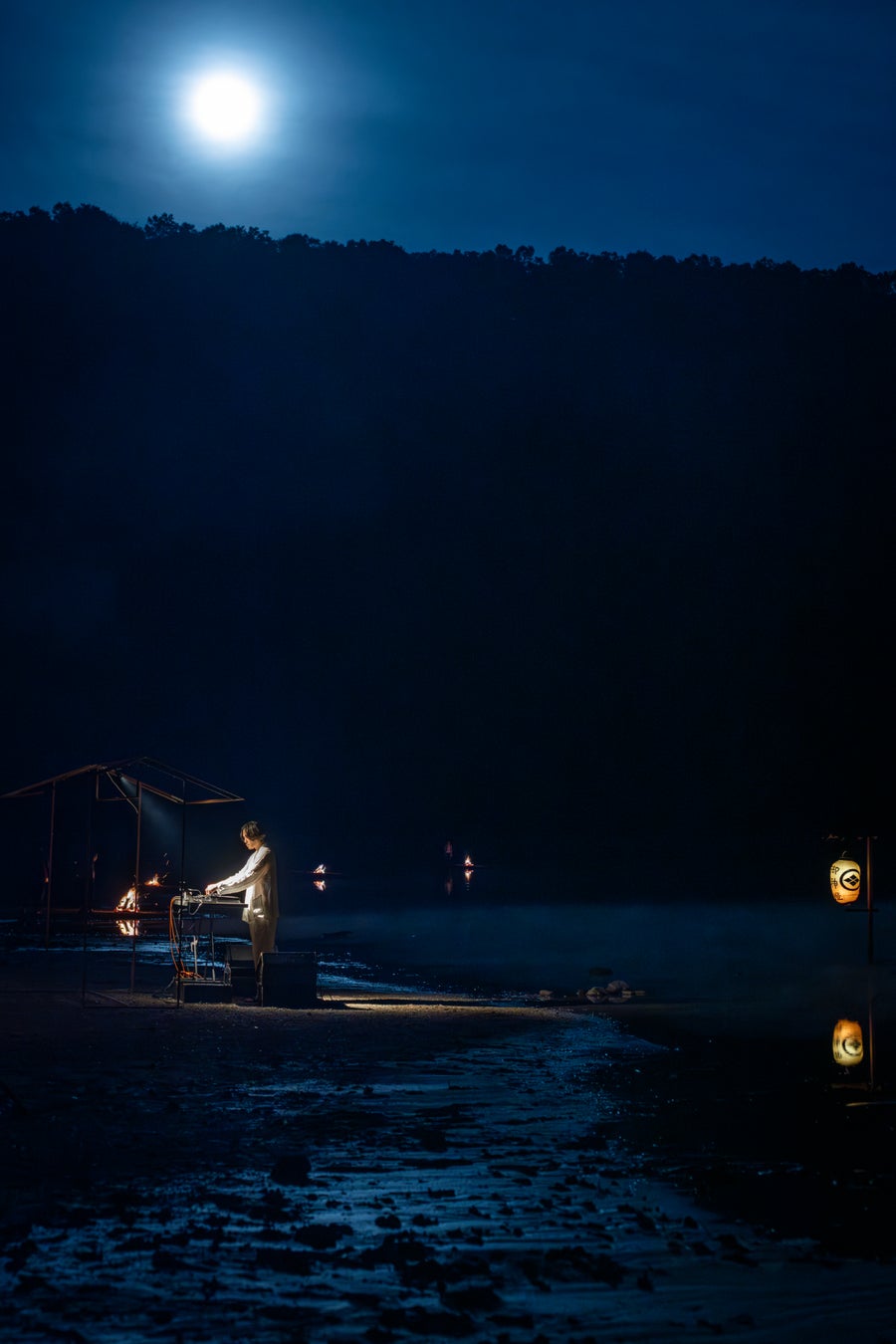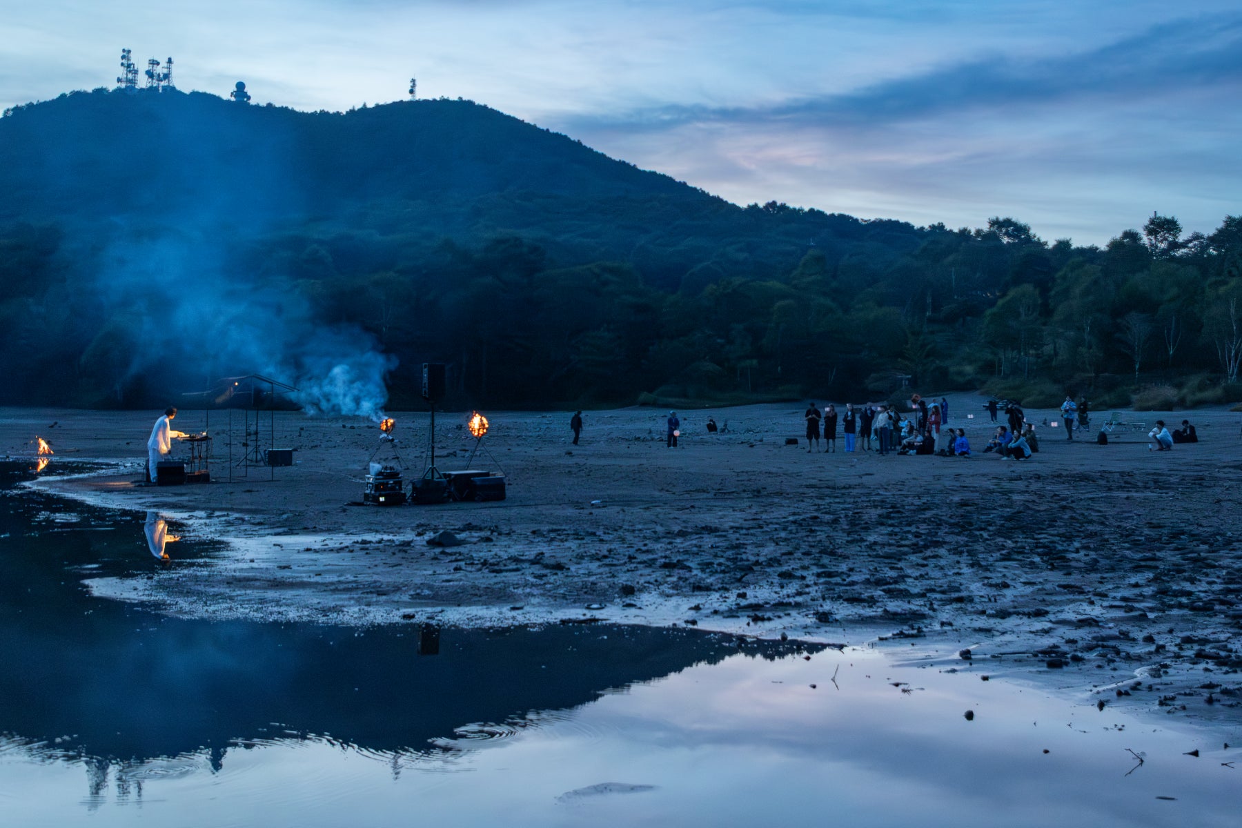 2025年、冥丁は赤城山の山頂に位置する火口湖「小沼」で演奏を行いました。水神が宿る神域とされてきた小沼では、当時、水位が急激に低下し、数ヶ月で半分以下にまで減少する異変が起きていました。その状況を受けて行われたのが、「雨乞い」としての奉納演奏です。松明の音だけが響く空間で「自分がどこにいるのかわからない」という感覚の中に立つ時間は、音楽を志した原初の記憶と重なるものでした。この体験は、“幽微なもの”をつくり続けることへの確信を与えたと冥丁は語ります。